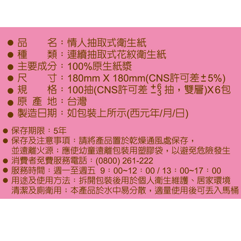 ◎Brand:情人 ◎Specifications: 100PC抽 x 6 x 1PC包