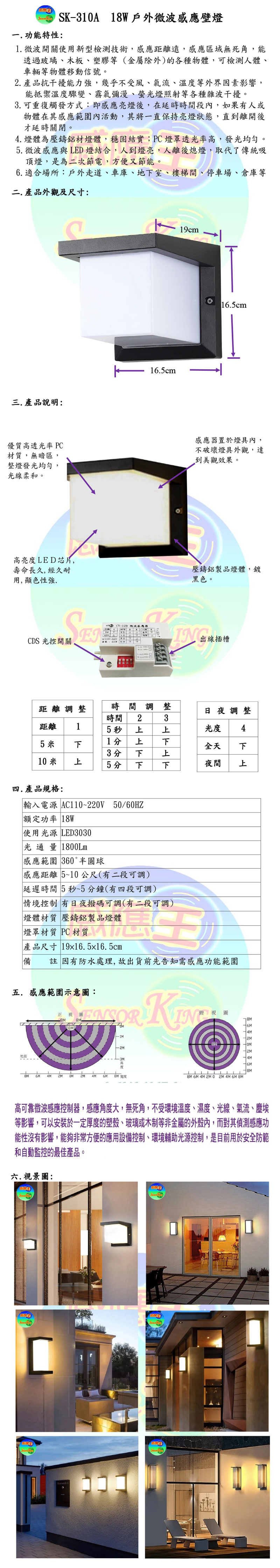 SK-310A 18W Outdoor Microwave Induction Wall Lamp (Adjustable Time, Day/Night, and Distance)