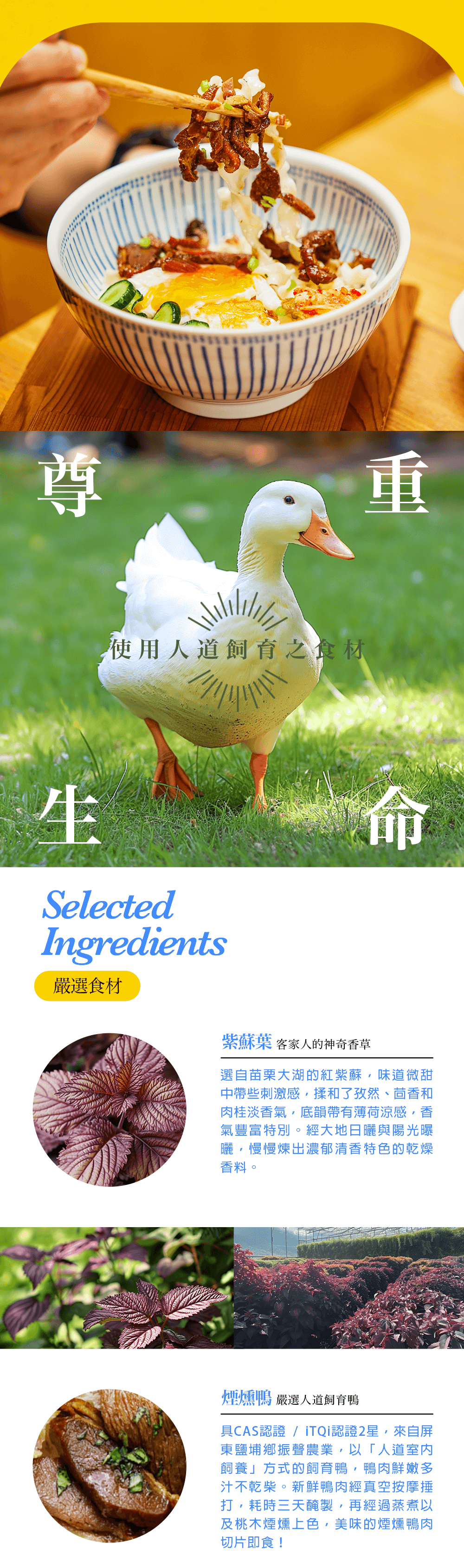 🎉風味新升級!鴨肉增量 10% 加量不加價!減鹽 29% 更健康採用法式油封手法將「人道飼育認證」鴨肉與客家紅紫蘇的裊裊燻香封存進油脂中,一點一滴都貴的台灣味。延續或者品牌精神「讓在地人驕傲、旅行者憧憬」所展開的五感閱讀,透過食材選擇、食物設計,打造讓人驚喜的醬料,同時推動永續飲食理念!●規格:185g 固形物:110g●特色食材:煙燻鴨腿、紫蘇葉●保存期限:2年●保存方式:未開封請常溫保存,避免高溫潮濕及日曬場所;開封後冷藏,並儘速食用完畢。●原產地:台灣