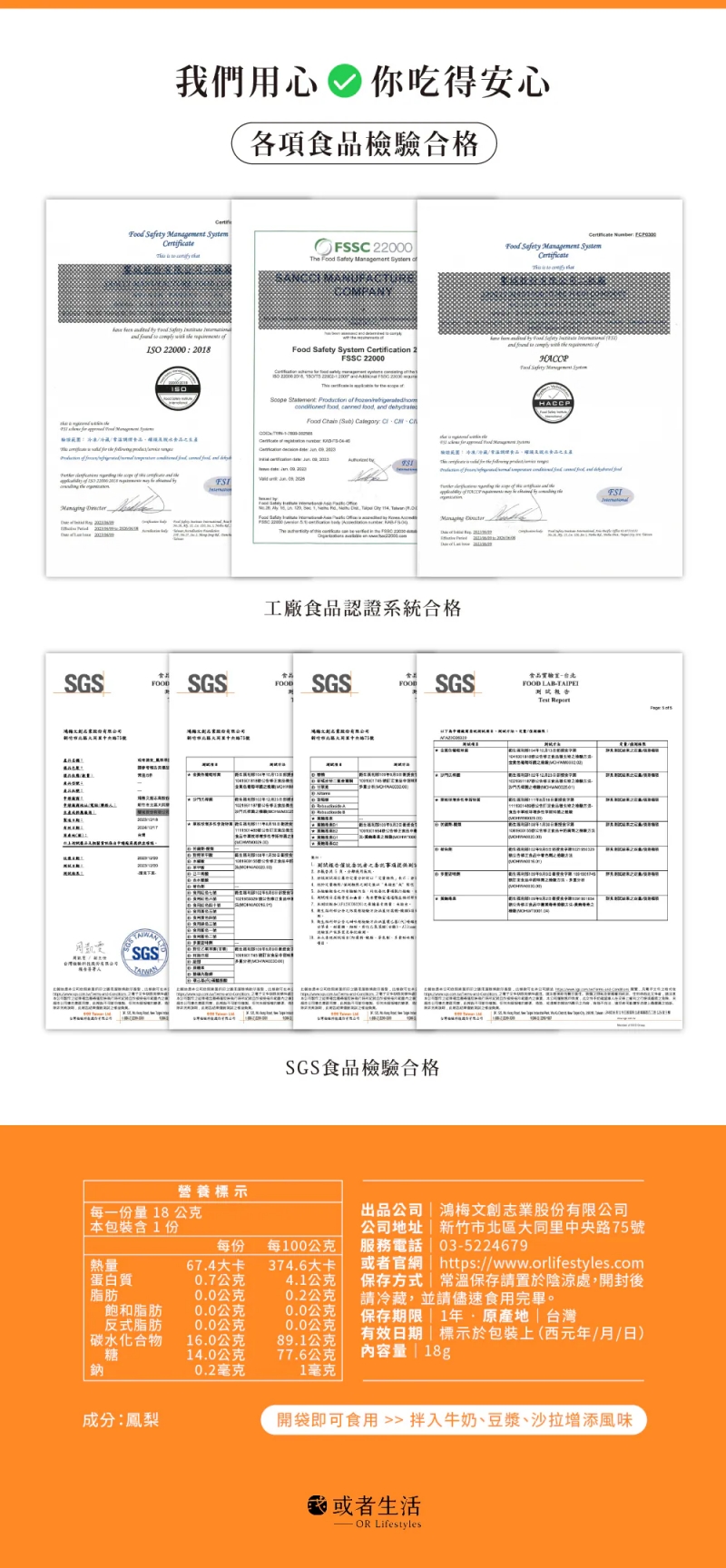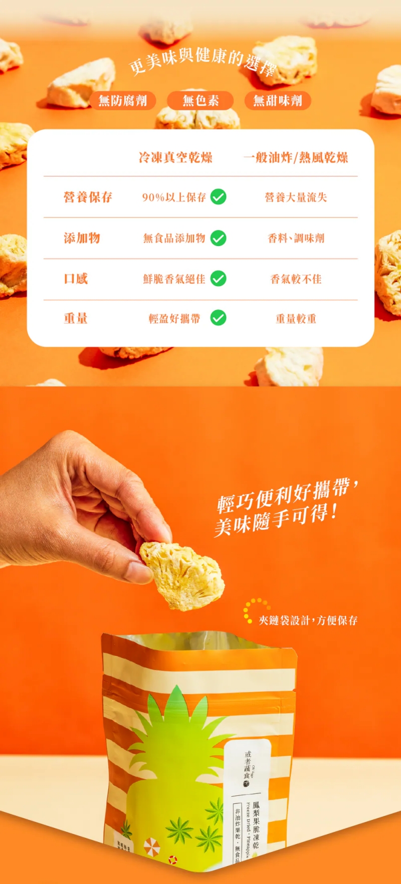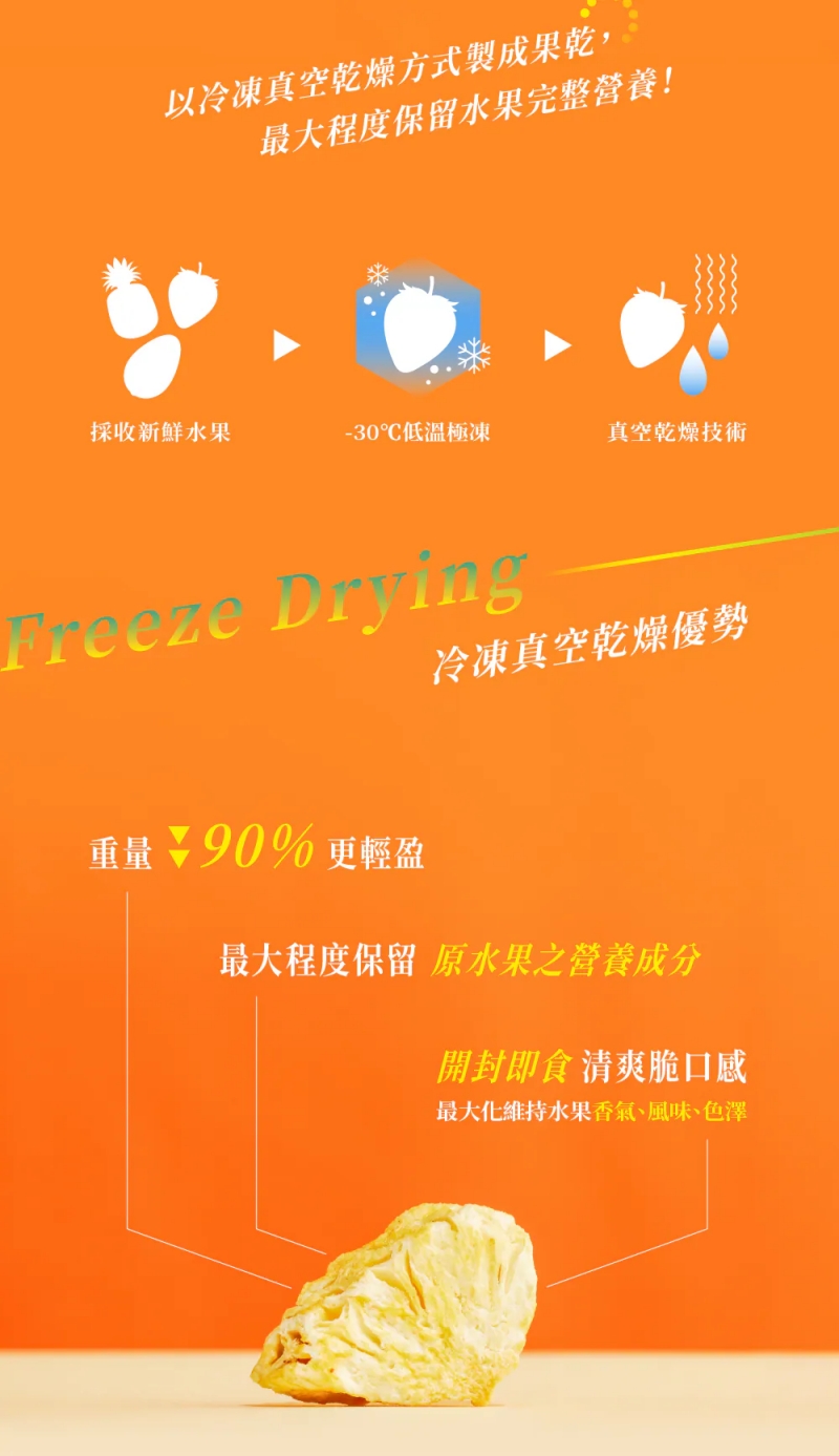 以「-30°冷凍」與「真空乾燥技術」,去除水果中水分,最大程度保留水果天然纖維、香氣及口感,封存滿滿營養成分!乾燥技術同時讓果物超輕量,果乾口感酥脆,入口即化,營養美味方便隨身帶著走!●規格:18g ●成分:鳳梨●保存期限:一年●保存方式:請保存於室溫陰涼處並避免陽光直射,開封後請密封保存並盡速食用完畢。●原產地:台灣