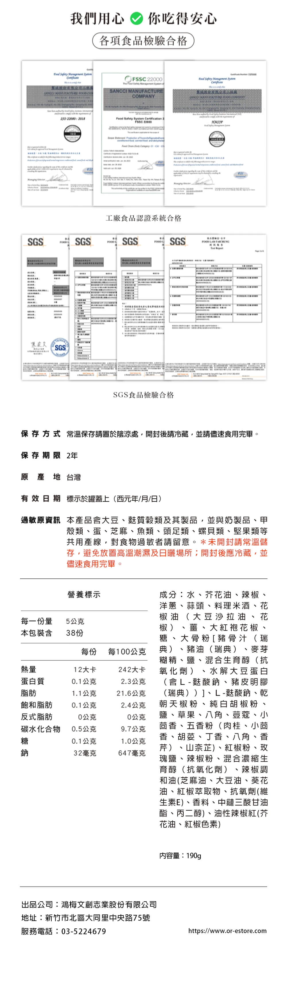 營養標示 每一份量 5公克 本包裝含 38份 每份 每100公克 熱量 12大卡 242大卡 蛋白質 0.1公克 2.3公克 脂肪 1.1公克 21.6公克 飽和脂肪 0.1公克 2.4公克 反式脂肪 0.0公克 0.0公克 碳水化合物 0.5公克 9.7公克 糖 0.1公克 1.0公克 鈉 32毫克 647毫克