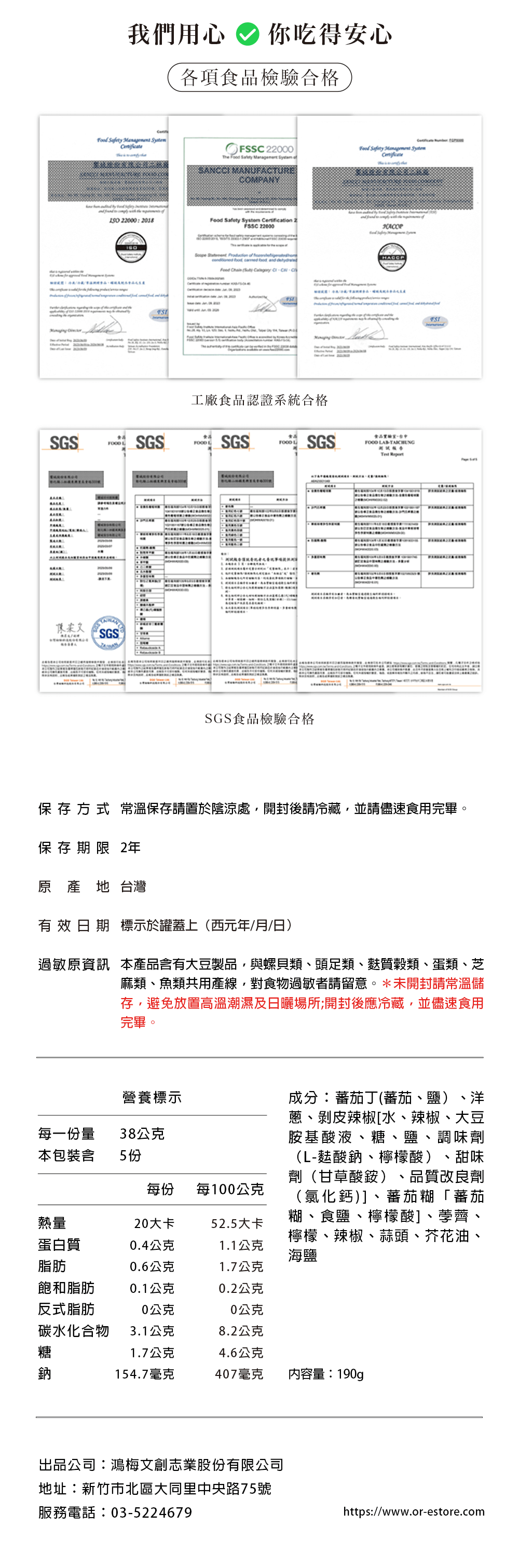 營養標示 每一份量38公克 本包裝含5份 每份 每100公克 熱量 20 大卡 52.5大卡 蛋白質 0.4公克 1.1公克 脂肪 0.6公克 1.7公克 飽和脂肪 0.1公克 0.2公克 反式脂肪 0公克 0公克 碳水化合物 3.1公克 8.2公克 糖 1.7公克 4.6公克 鈉 154.7毫克 407毫克