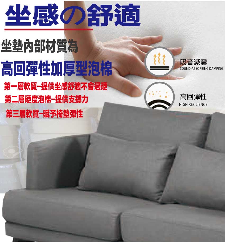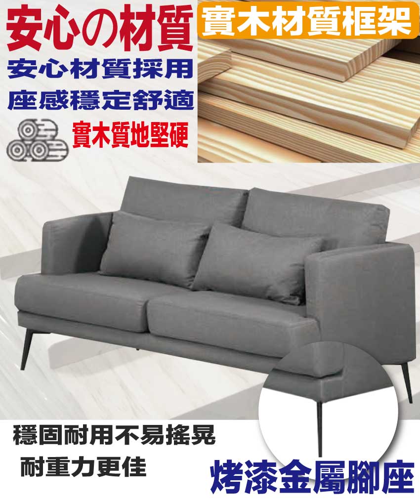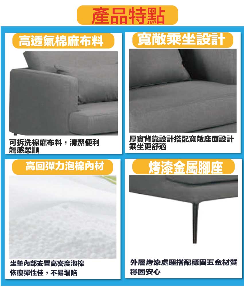 採用內部實木板材框架+烤漆金屬腳座+透氣棉麻布料+高回彈力加厚泡棉等安心材質製造