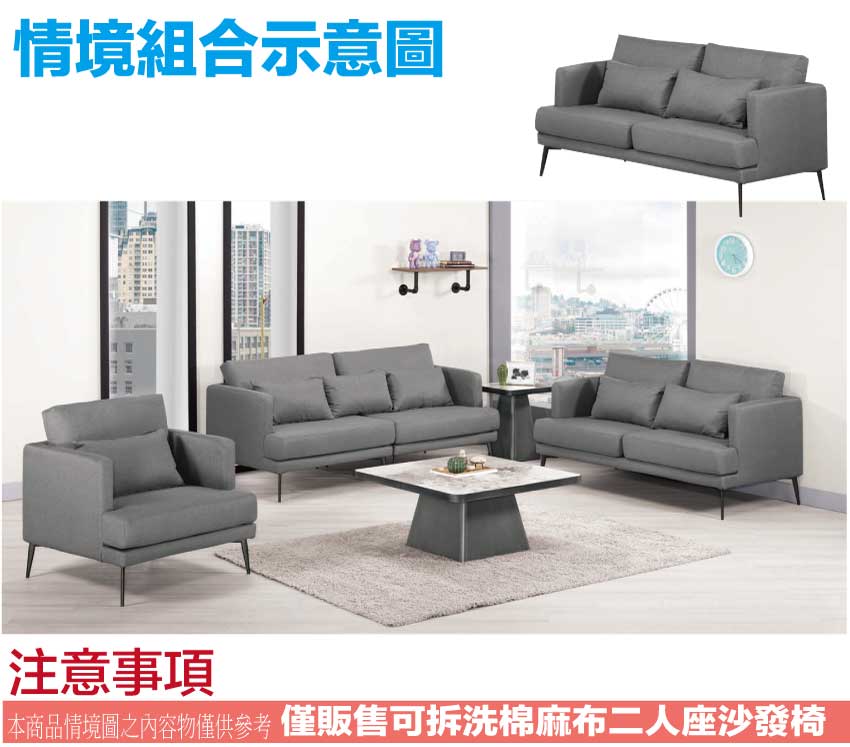 【文創集】山德灰色透氣棉麻布二人座組合 時尚灰色系+現代美型外觀+安心材質製造,就是這種頂級質感的設計,能輕鬆地融入各種空間風格,採用內部實木板材框架+烤漆金屬腳座+透氣棉麻布料+高回彈力加厚泡棉等安心材質製造,品質安心有保障,現在購買專人送到府服務,免組裝+免運費,讓你省時省力省運費!