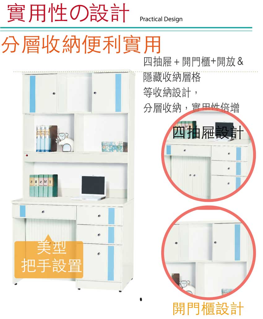 開門櫃+推門櫃+四抽屜+開放收納層格等便利收納空間設計