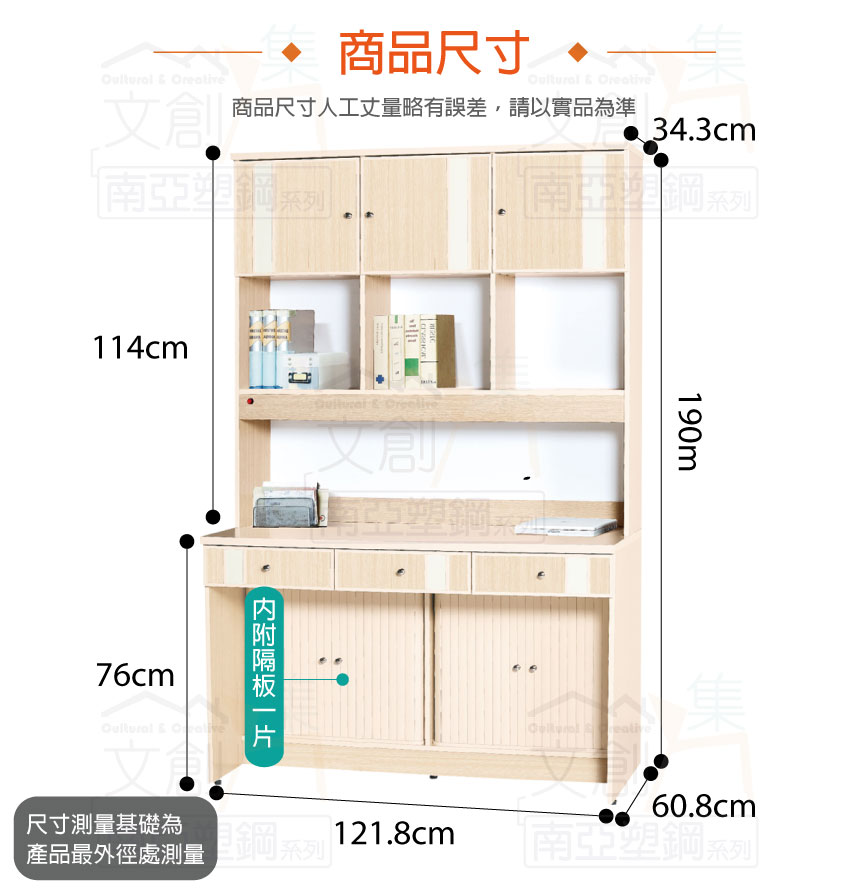 【文創集】普曼 環保4.1尺南亞塑鋼多功能三抽書桌組合(上+下座組合) 產品採用第一品牌-台製南亞塑鋼舒美板+五金滑軌結構等材質,整體材質採用防水+防燃+無甲醛安心塑鋼材質製造 ,搭配開門櫃+三抽屜+開放收納層格等便利收納空間設計,防止受潮,增加支撐力,堅固不會塌陷,全由專人配送到家,專業安心服務,替你省下更多時間!