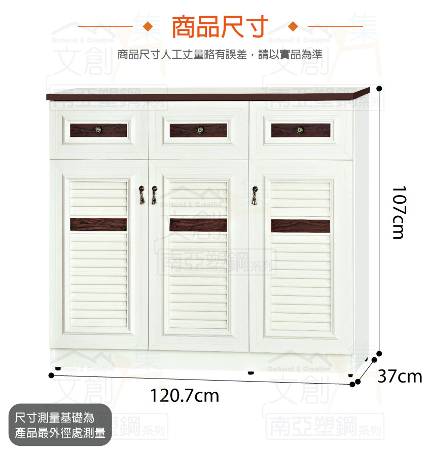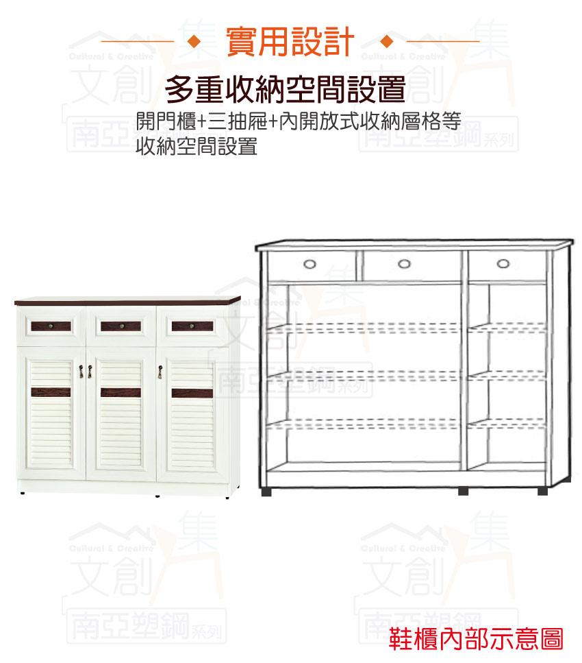 【文創集】麥納 環保4尺南亞塑鋼三門三抽鞋櫃 產品採用第一品牌-台製南亞塑鋼舒美板+五金滑軌結構材質,整體材質採用防水+防燃+無甲醛安心塑鋼材質製造 ,搭配開門櫃+三抽屜+內開放式多層格等便利收納空間設計,防止受潮,增加支撐力,堅固不會塌陷,全由專人配送到家,專業安心服務,替你省下更多時間!