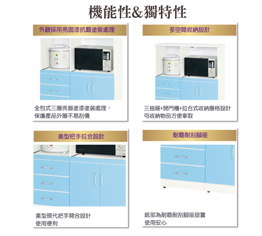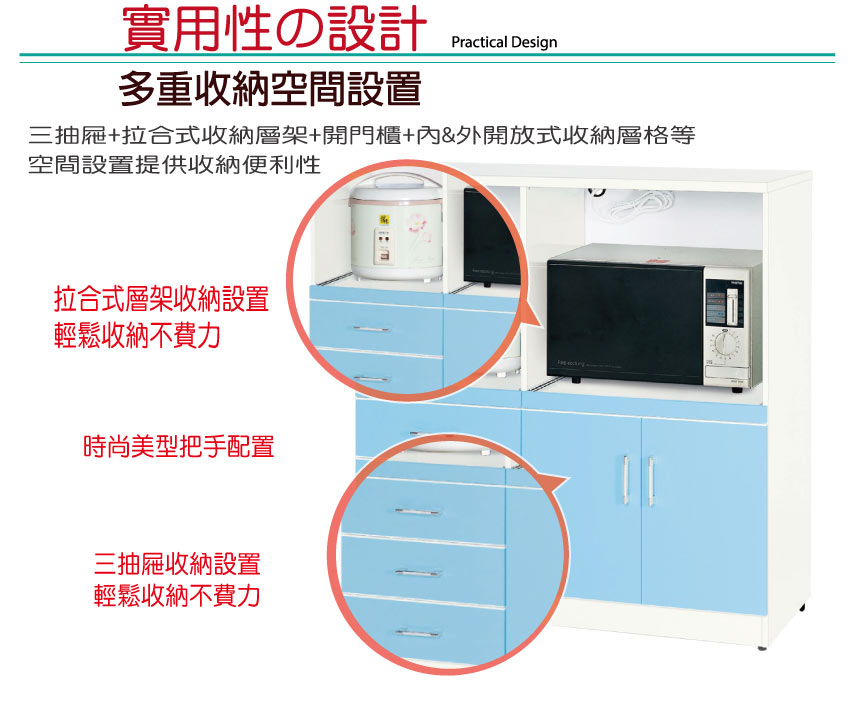 開門櫃+三抽屜+內&外開放式層格+拉合式層架等便利收納空間設計