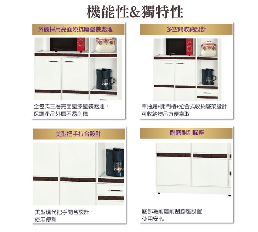 開門櫃+單抽屜+內&外開放式層格+拉合式層架等便利收納空間設計