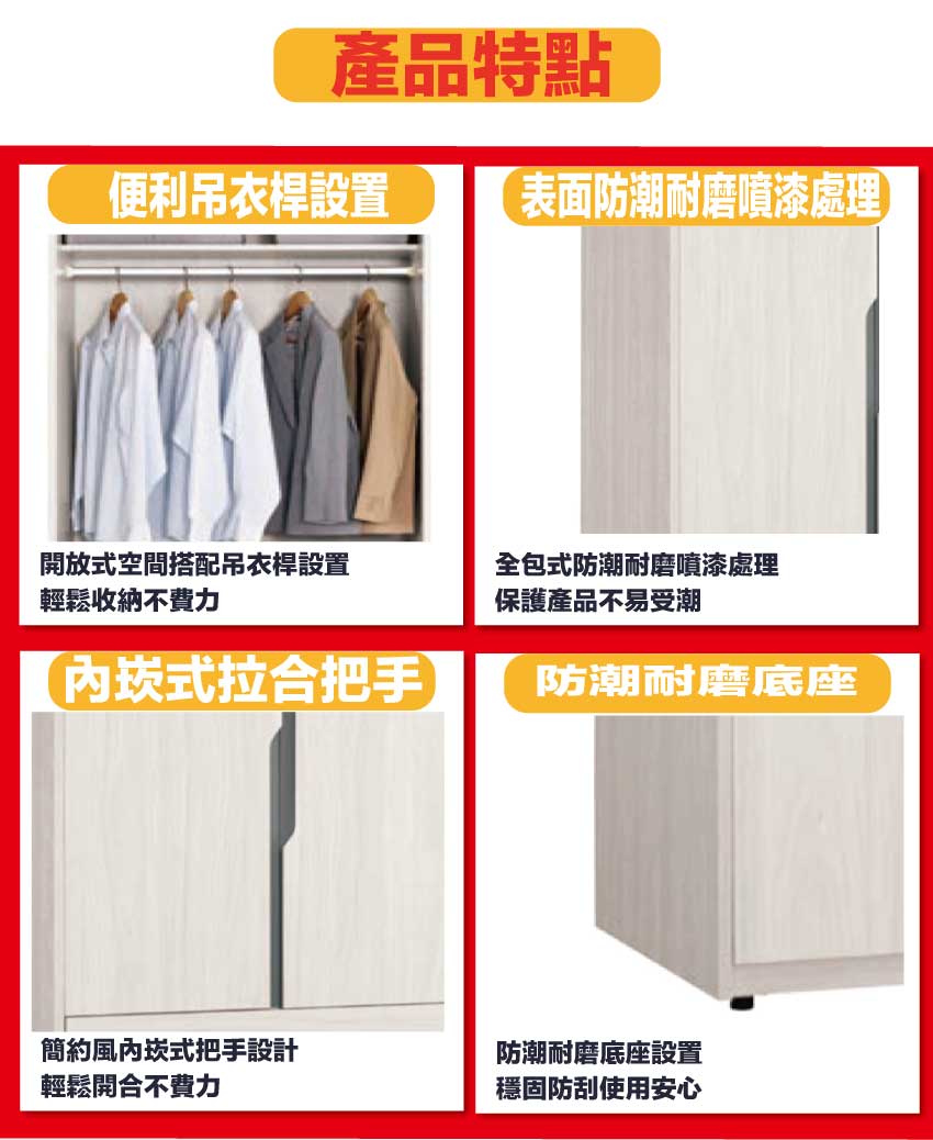 採用防蛀木心板+防潮耐磨底座+防夾手緩衝門片五金等安心材質製造