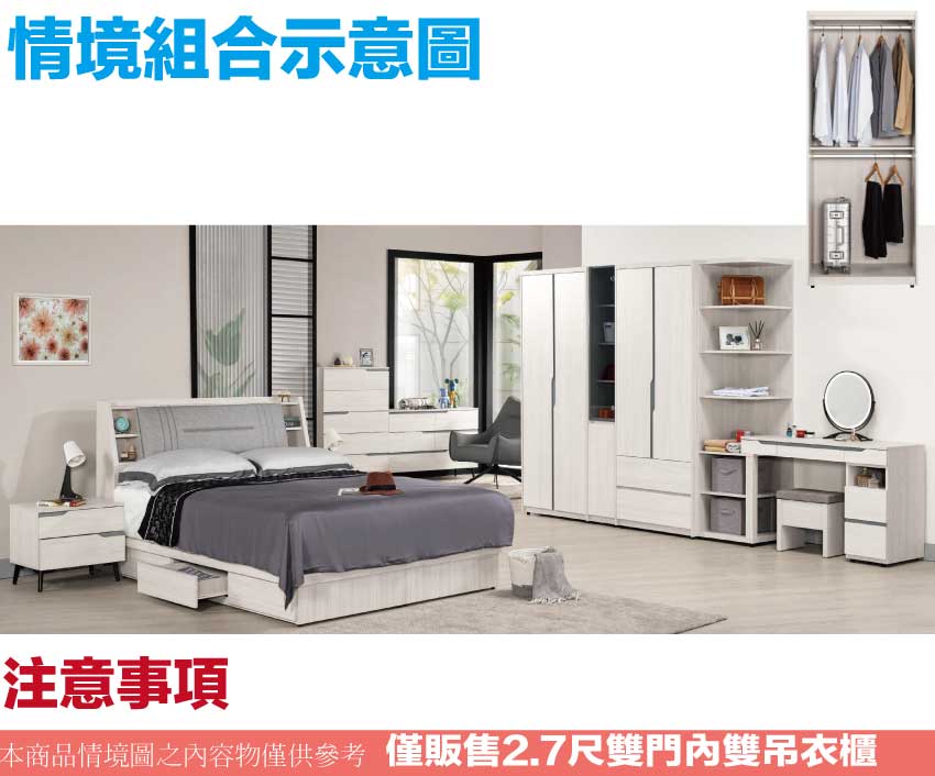 搭配採用開門櫃+吊衣桿+內開放層格等收納空間設計