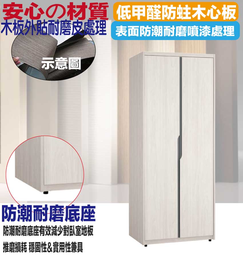 【文創集】丹尼2.7尺二門內雙吊衣櫃 淺橡木紋色系+安心材質製造,使用放心+搭配居家更便利,採用防蛀木心板+防潮耐磨底座+防夾手緩衝門片五金等安心材質製造 ,外層採用防潮耐磨噴漆處理搭配採用開門櫃+吊衣桿+內開放層格等收納空間設計,全由專人配送到家,專業安心服務,替你省下更多時間!