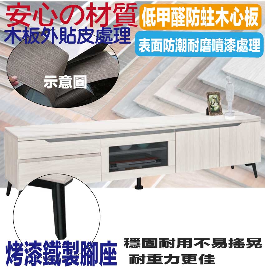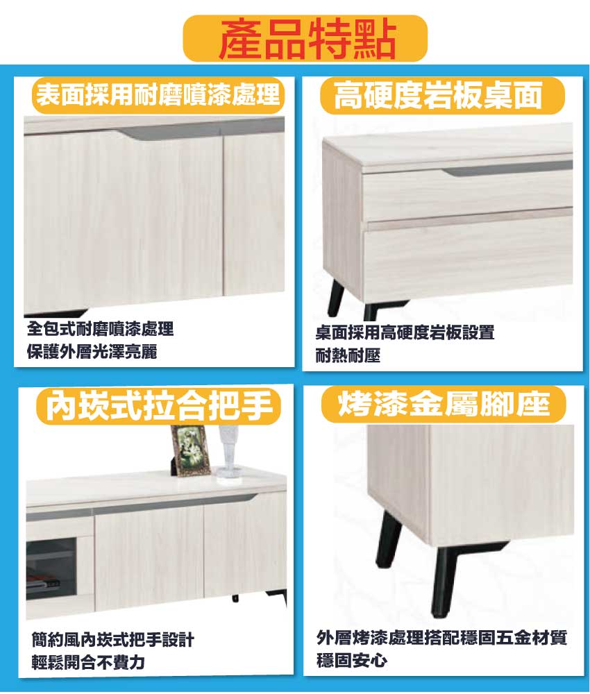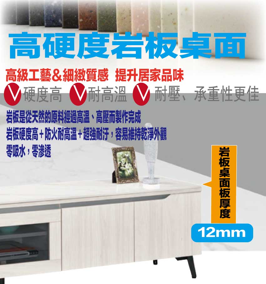 採用防蛀木心板+烤漆五金腳座+防夾手緩衝門片五金+5mm強化灰玻璃+12mm高硬度岩板桌面板+五金滑軌結構等安心材質製造