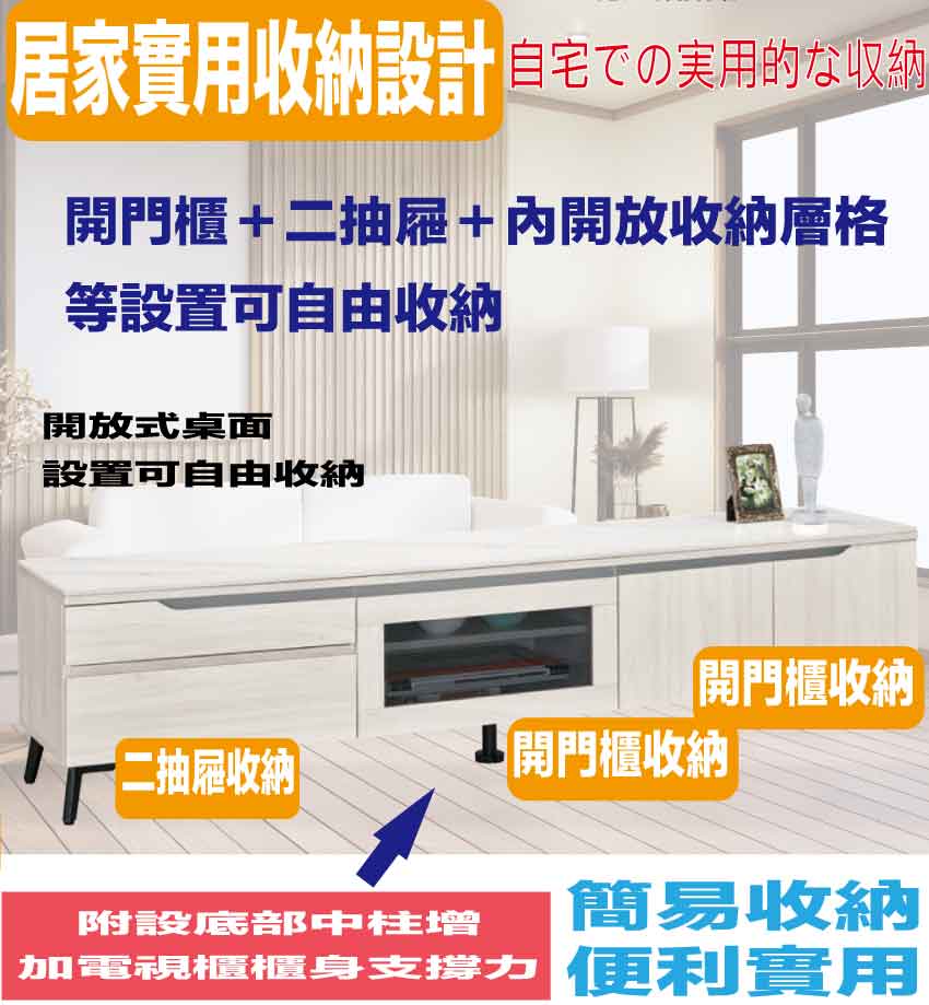 搭配採用開門櫃+二抽屜+內開放層格等收納空間設計