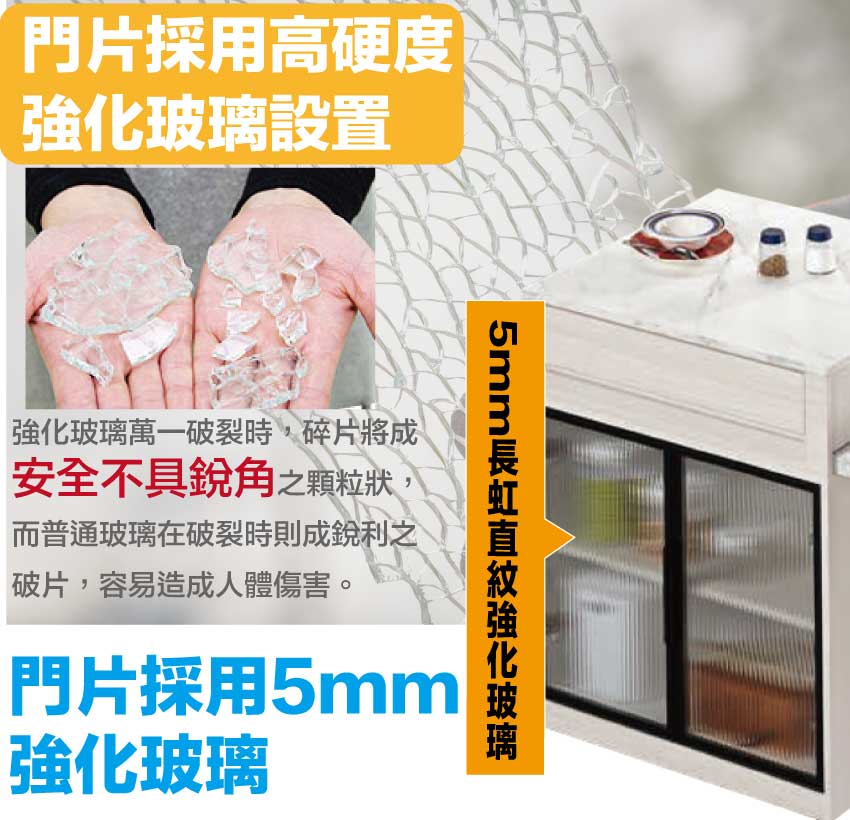 採用防蛀木心板+防潮耐磨底座+防夾手緩衝門片五金+仿石紋耐磨美耐皿桌面板+5mm強化直紋玻璃+五金滑軌結構等安心材質製造