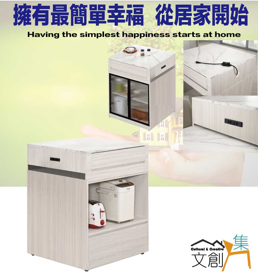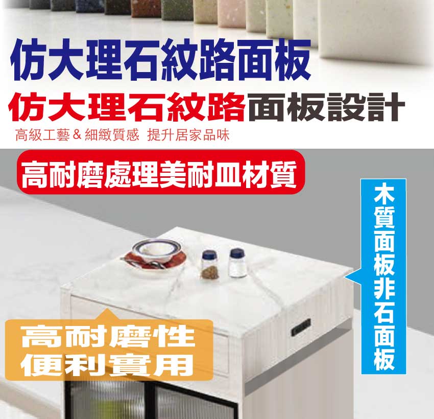 材質:防蛀木心板+防潮耐磨腳座+防夾手緩衝門片五金+仿石紋耐磨美耐皿桌面板+5mm強化直紋玻璃+五金滑軌結構