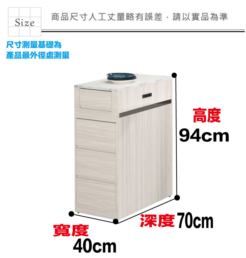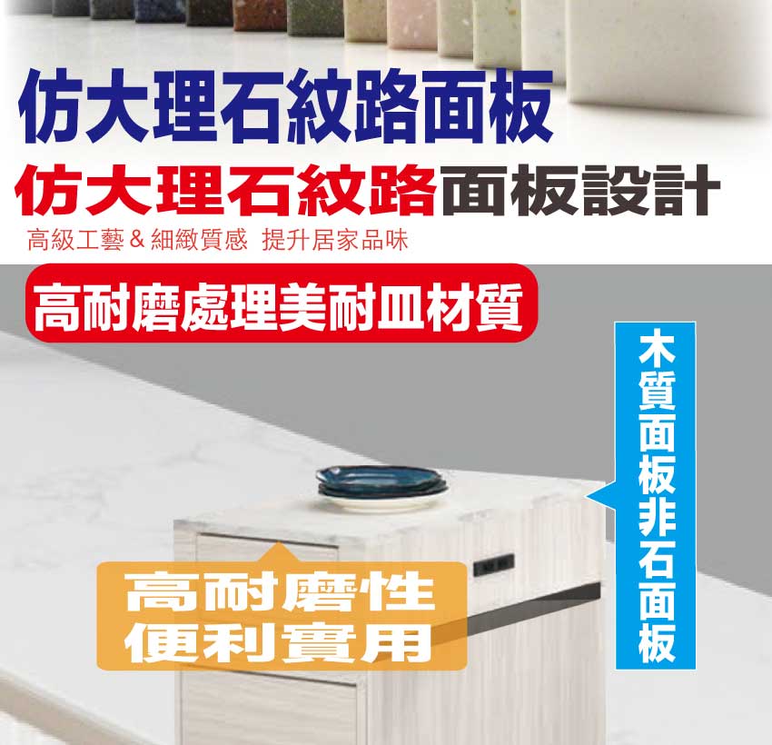 材質:防蛀木心板+防潮耐磨腳座+防夾手緩衝門片五金+仿石紋耐磨美耐皿桌面板+5mm強化直紋玻璃+五金滑軌結構