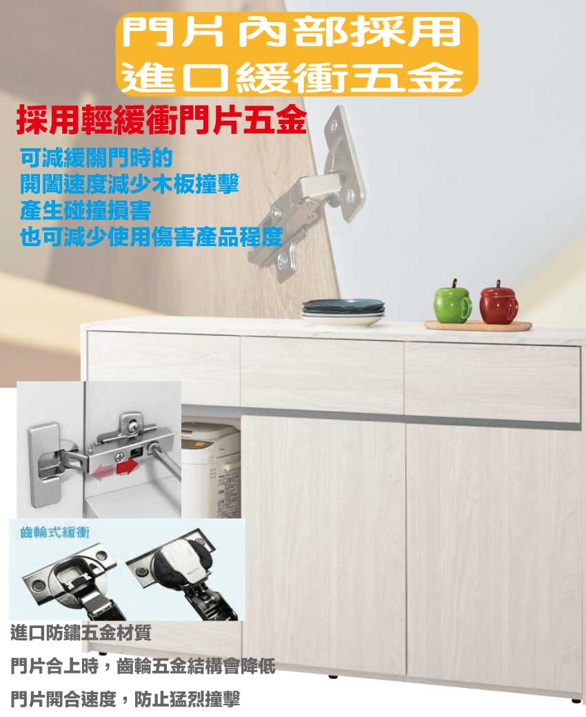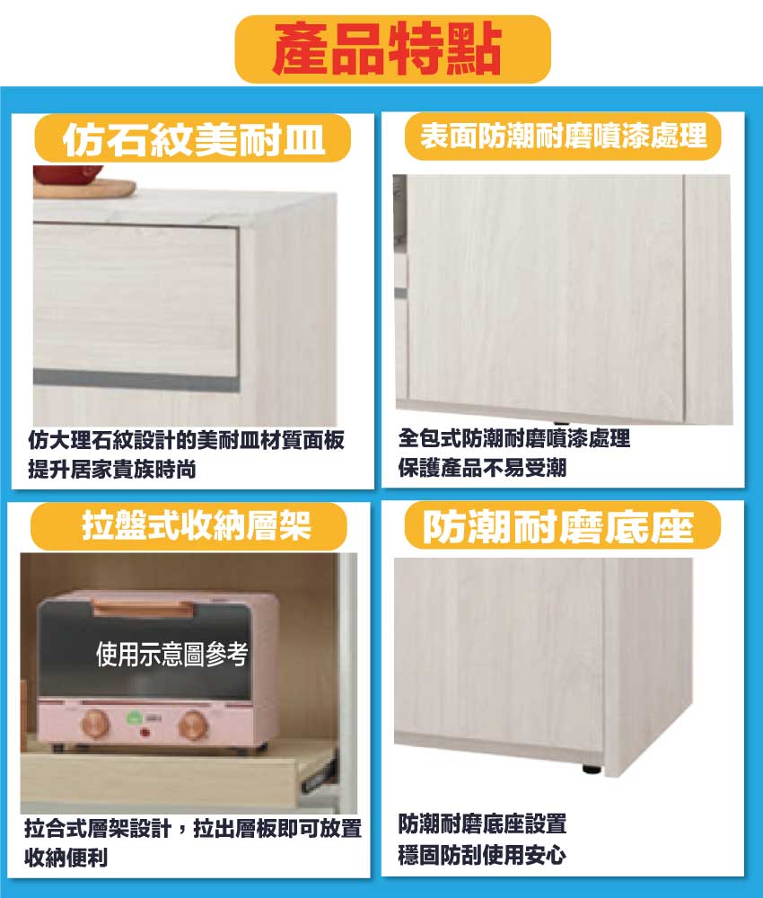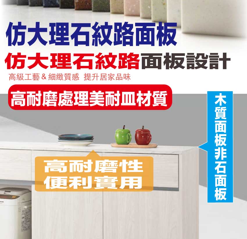 材質:防蛀木心板+防潮耐磨底座+防夾手緩衝門片五金+仿石紋耐磨美耐皿桌面板+五金滑軌結構