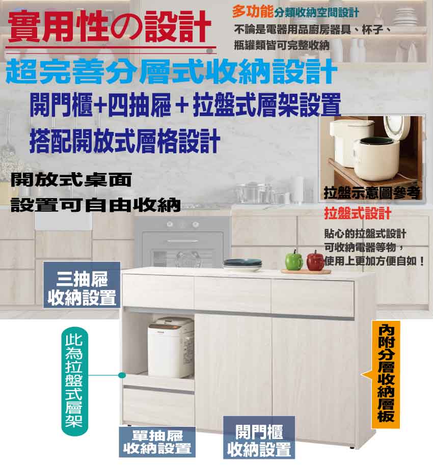搭配採用開門櫃+拉盤層架+三抽屜+內&外開放層格等收納空間設計