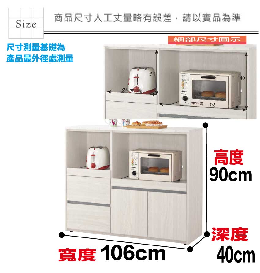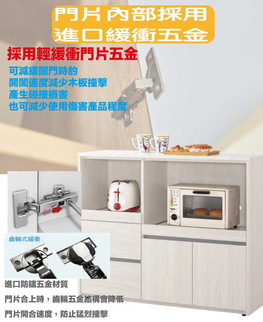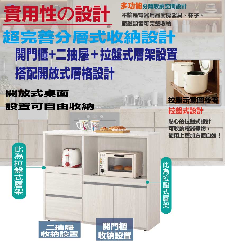 搭配採用開門櫃+拉盤層架+二抽屜+內&外開放層格等收納空間設計