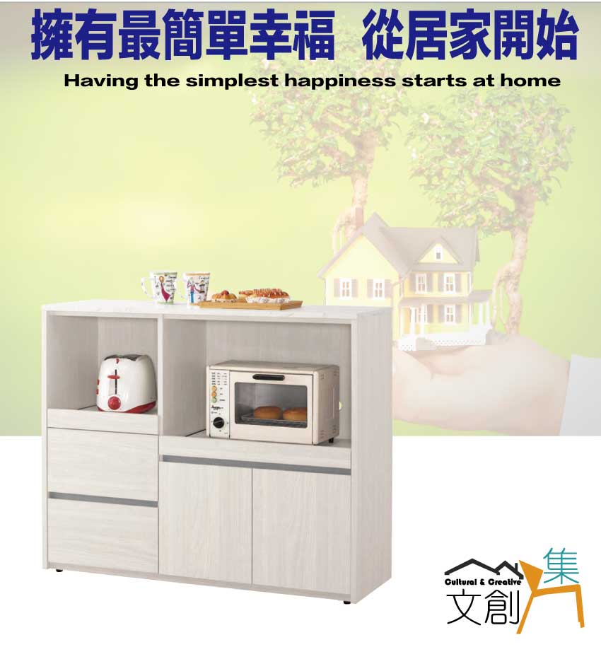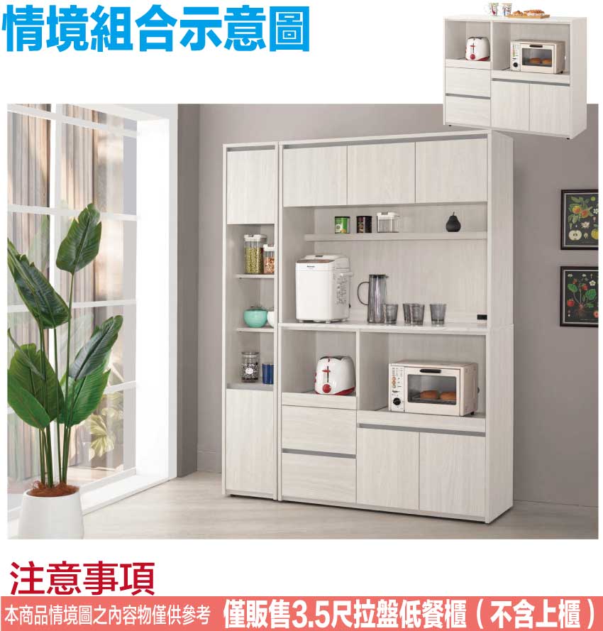 【文創集】華爾雙色3.5尺二門雙拉盤低餐櫃 木紋雙色系+安心材質製造,使用放心+搭配居家更便利,採用防蛀木心板+防潮耐磨底座+防夾手緩衝門片五金+仿石紋耐磨美耐皿桌面板+五金滑軌結構等安心材質製造 ,外層採用防潮耐磨噴漆處理搭配採用開門櫃+拉盤層架+二抽屜+內&外開放層格等收納空間設計,全由專人配送到家,專業安心服務,替你省下更多時間!