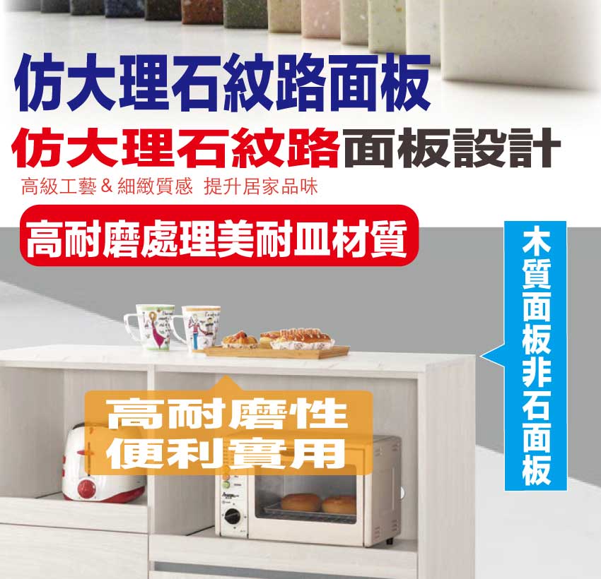 材質:防蛀木心板+防潮耐磨底座+防夾手緩衝門片五金+仿石紋耐磨美耐皿桌面板+五金滑軌結構