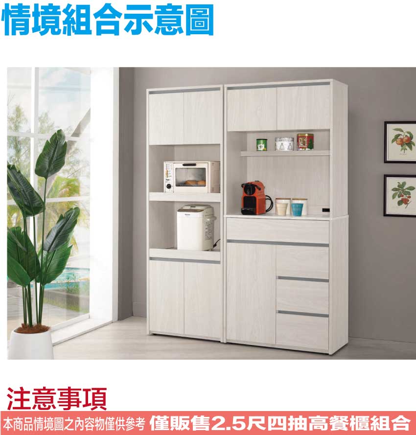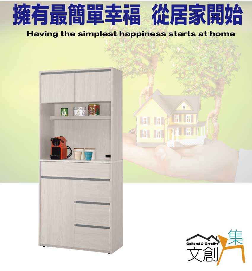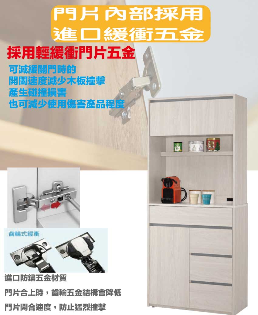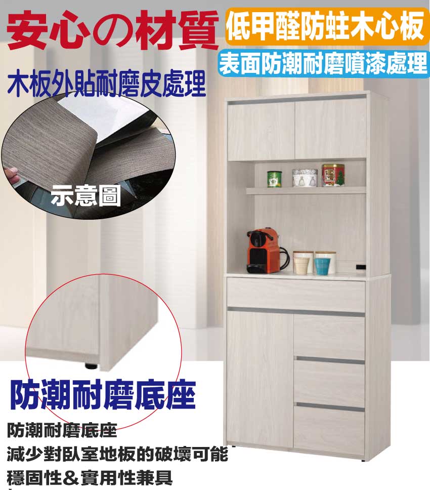 【文創集】華爾雙色2.5尺三門四抽高餐櫃組合 木紋雙色系+安心材質製造,使用放心+搭配居家更便利,採用防蛀木心板+防潮耐磨底座+防夾手緩衝門片五金+仿石紋耐磨美耐皿桌面板+五金滑軌結構等安心材質製造 ,外層採用防潮耐磨噴漆處理搭配採用開門櫃+四抽屜+內&外開放層格+便利插座等收納空間設計,全由專人配送到家,專業安心服務,替你省下更多時間!