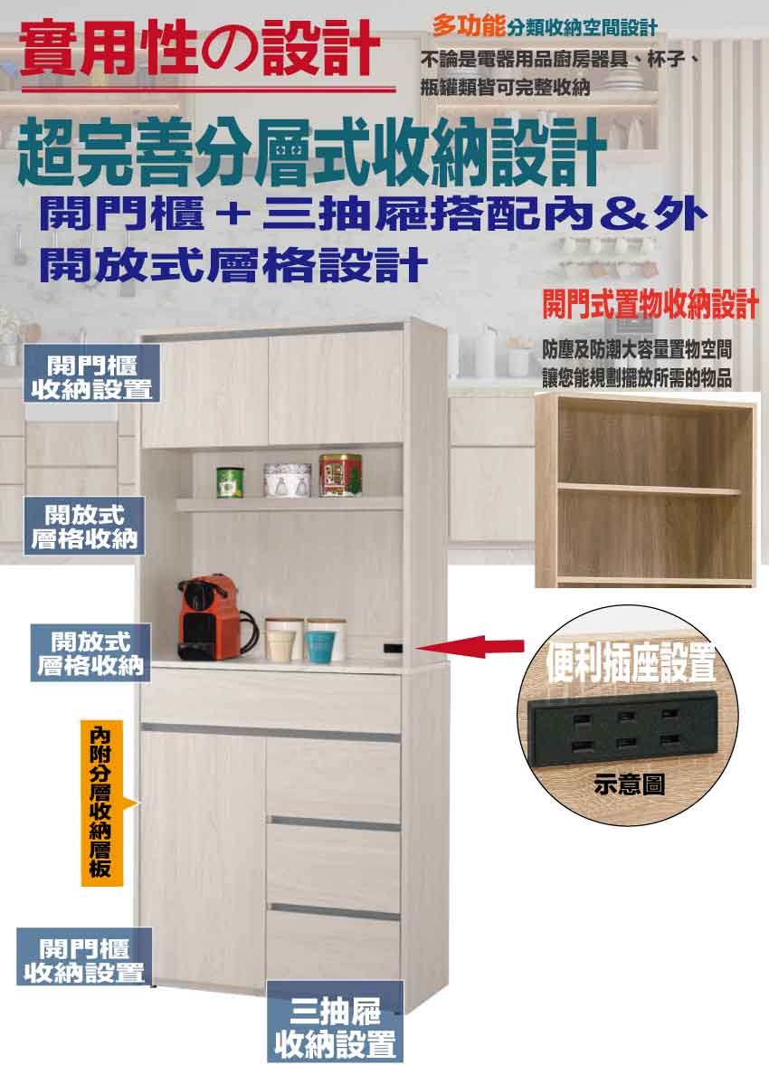 搭配採用開門櫃+四抽屜+內&外開放層格+便利插座等收納空間設計