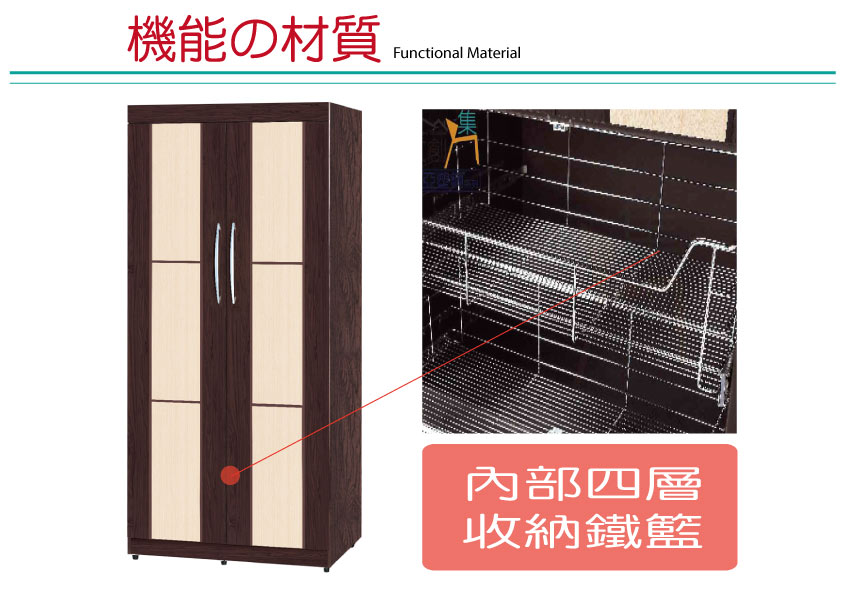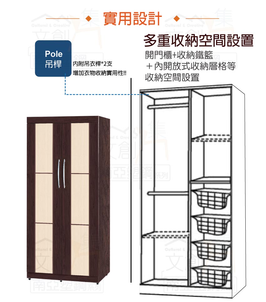 搭配開門櫃+吊衣桿+收納鐵籃+內開放式收納等便利設計
