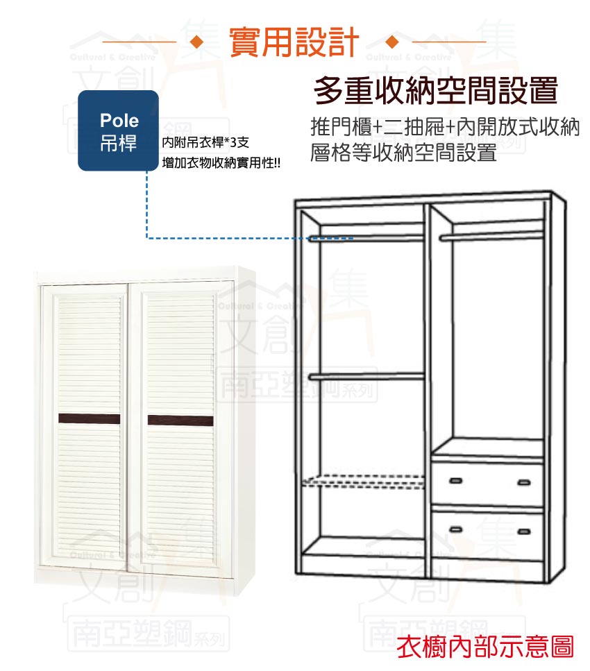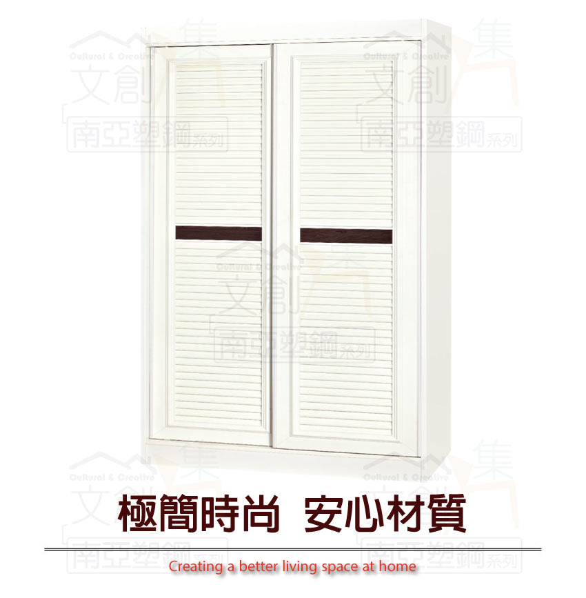 【文創集】凱菲 環保4.2尺南亞塑鋼百葉雙推門二抽高衣櫃/收納櫃 產品採用第一品牌-台製南亞塑鋼舒美板+五金滑軌結構等材質,整體材質採用防水+防燃+無甲醛安心塑鋼材質製造 ,搭配推門櫃+吊衣桿+二抽屜+內開放式收納等便利設計,防止受潮,增加支撐力,堅固不會塌陷,全由專人配送到家,專業安心服務,替你省下更多時間!