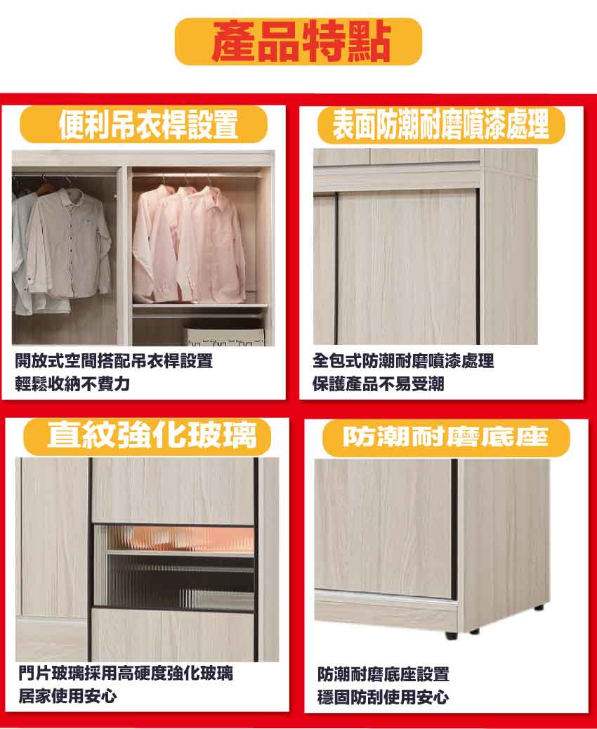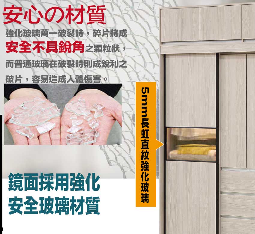 採用防蛀木心板+防潮耐磨底座+五金滑軌結構+防夾手緩衝門片五金+5mm直紋強化玻璃等安心材質製造