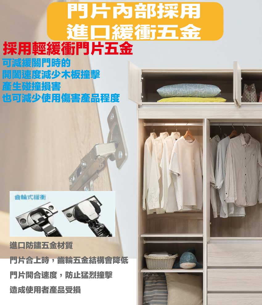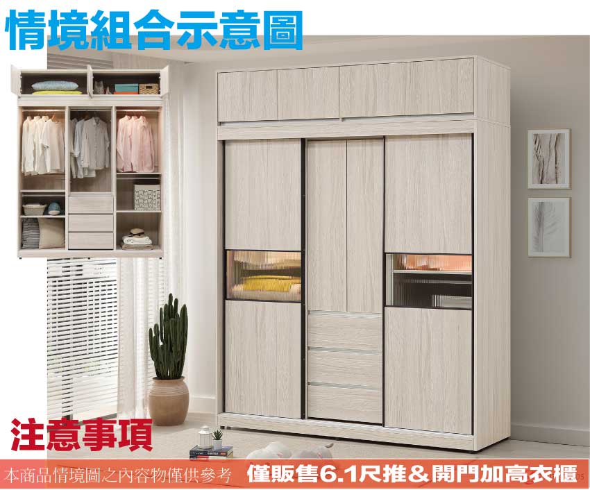 【文創集】希望6.1尺開&推門加高衣櫃組合 淺橡木紋色系+安心材質製造,使用放心+搭配居家更便利,採用防蛀木心板+防潮耐磨底座+五金滑軌結構+防夾手緩衝門片五金+5mm直紋強化玻璃等安心材質製造 ,外層採用防潮耐磨噴漆處理搭配採用開門櫃&推門櫃+吊衣桿+三抽屜+內開放層格等收納空間設計,全由專人配送到家,專業安心服務,替你省下更多時間!