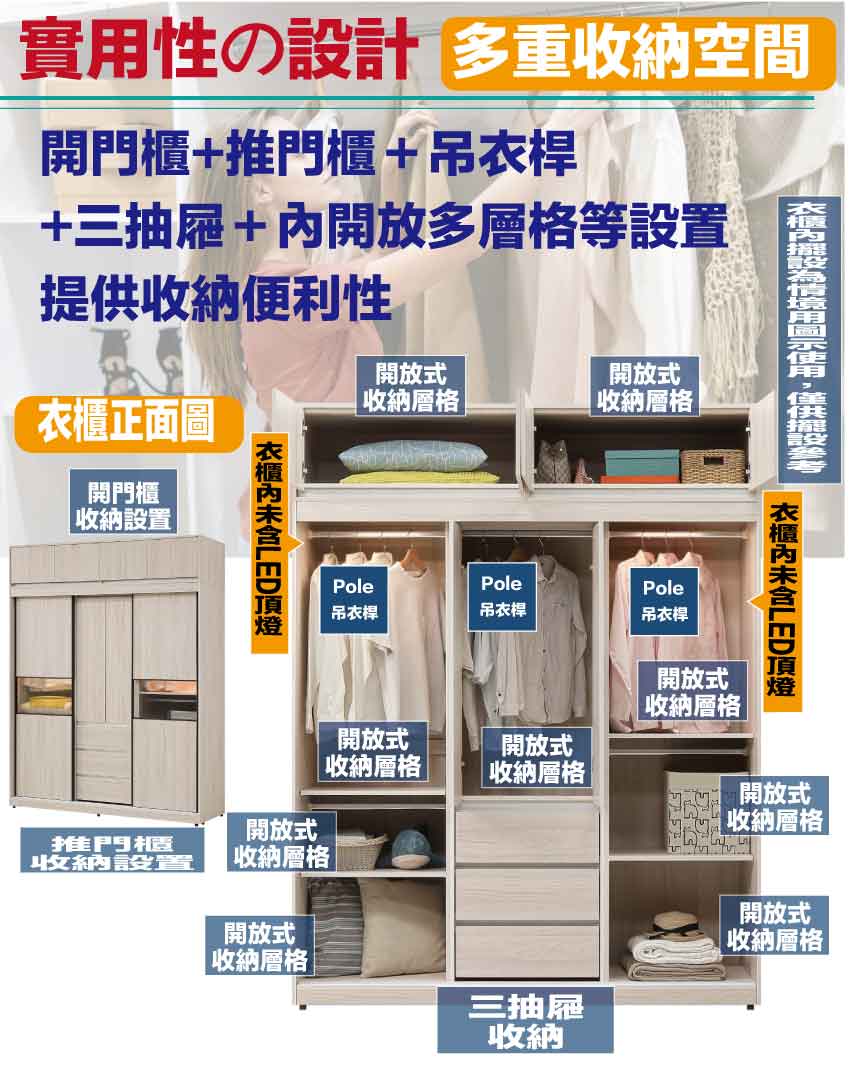 搭配採用開門櫃&推門櫃+吊衣桿+三抽屜+內開放層格等收納空間設計