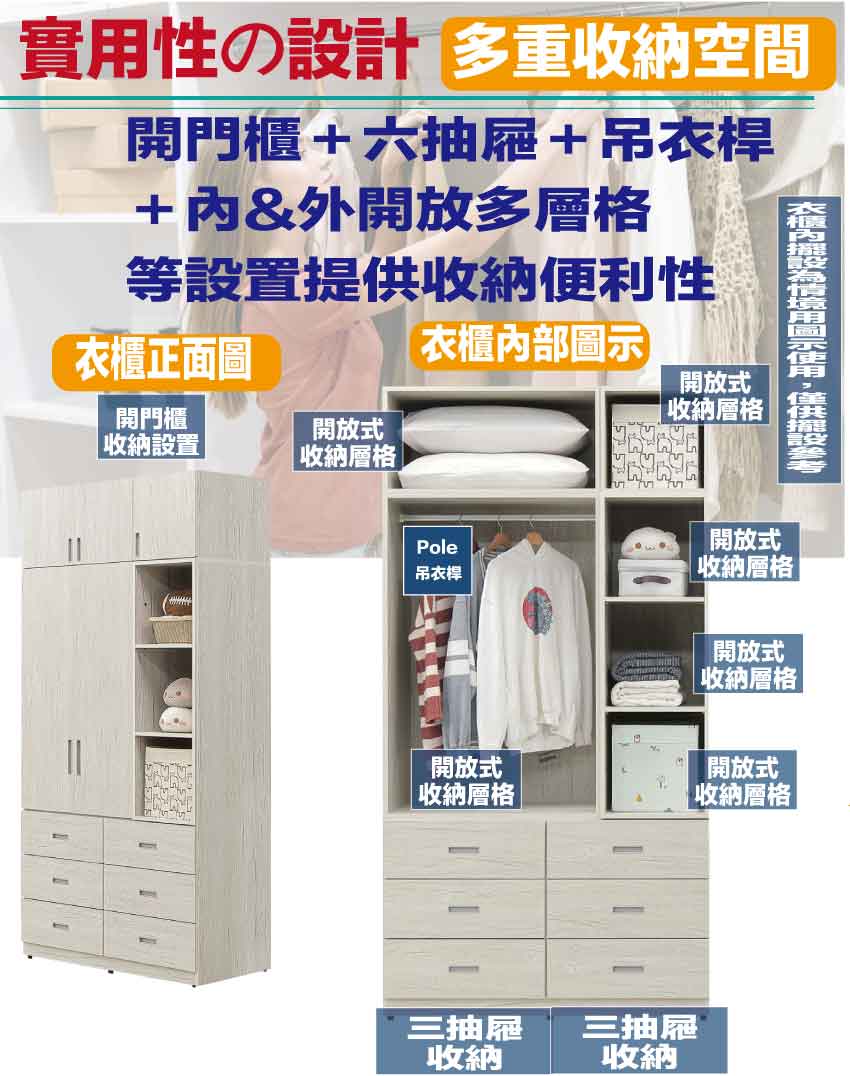 搭配開門櫃+吊衣桿+六抽屜+內&外開放層格等收納空間設計