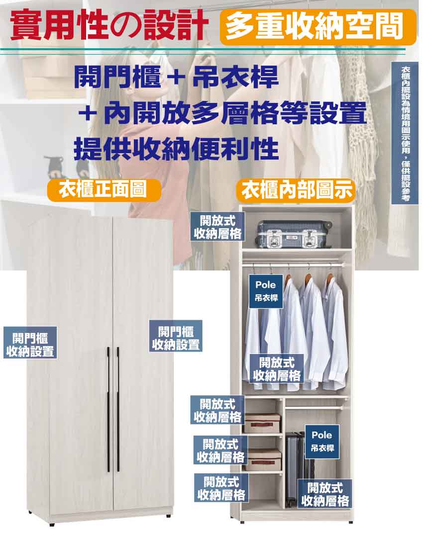 搭配採用開門櫃+吊衣桿+內開放層格等收納空間設計