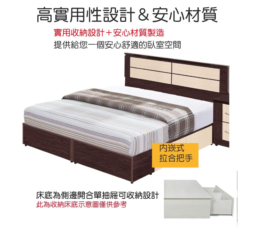 床頭片搭配床底為側邊開合二抽屜收納設計