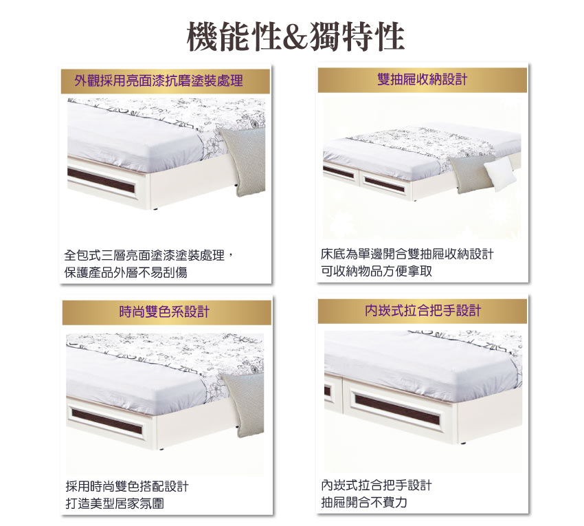 搭配床底為床尾開合二抽屜收納設計
