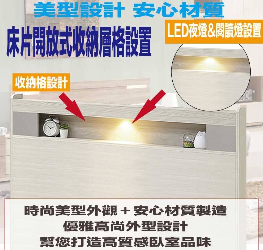 搭配床頭片採用開放式層格+LED夜燈設置等收納空間設計