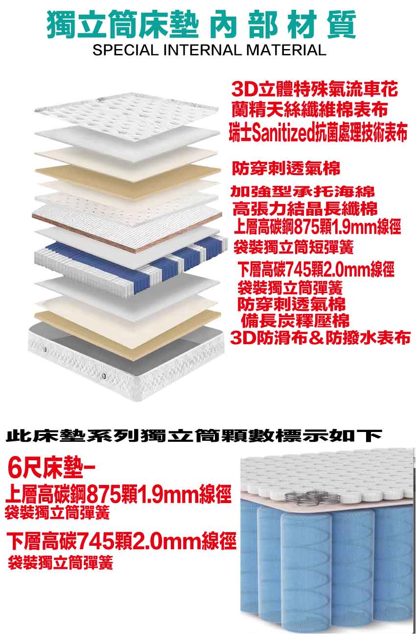 【文創集-床墊系列】3D天絲5尺雙人雙層獨立筒床墊◆商品尺寸:(寬)150x (深)188 x (高)33/公分◆商品材質:蘭精天絲纖維棉料表布+雙層獨立筒彈簧結構(上層高碳鋼875顆1.9MM獨立筒彈簧+下層高碳鋼745顆2.0MM獨立筒彈簧)+瑞士Sanitized抗菌處理技術針織舒柔布+防穿刺透氣棉+止滑透氣底布 +加強型承托海綿+高張力結晶長織棉+3D立體特殊氣流車花+備長碳釋壓棉此款床墊較為厚重搬運時不可彎壓,產品接單時會有專人和您確認電梯或是樓梯寬度,避免造成無法配送搬運造成您時間及成本損耗,請見諒◆商品保固:中鋼彈簧體保固5年(正常使用),保用10年本產品款式共有單人加大(105cm)&雙人(150cm)&雙人加大(180cm)等三種尺寸可供您選擇,請先確定床台的尺寸再購買