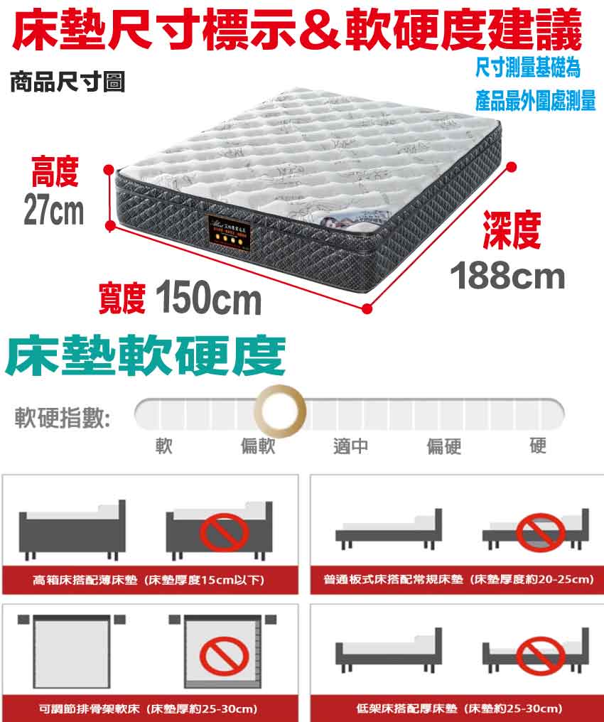 【文創集-床墊系列】3D天絲抗菌5尺雙人獨立筒床墊◆商品尺寸:(寬)150x (深)188 x (高)27/公分◆商品材質:蘭精天絲纖維棉料表布+瑞士Sanitized抗菌處理技術+防穿刺透氣棉+加強形承托海棉+高張力結晶長織棉+備長碳釋壓棉+立體特殊氣流車花+高碳鋼621顆2.0mm線徑袋裝獨立筒彈簧+M字型邊框加強支撐結構+3D止滑&防潑水表布◆商品保固:中鋼彈簧體保固5年(正常使用),保用10年本產品款式共有單人加大(105cm)&雙人(150cm)&雙人加大(180cm)等三種尺寸可供您選擇,請先確定床台的尺寸再購買