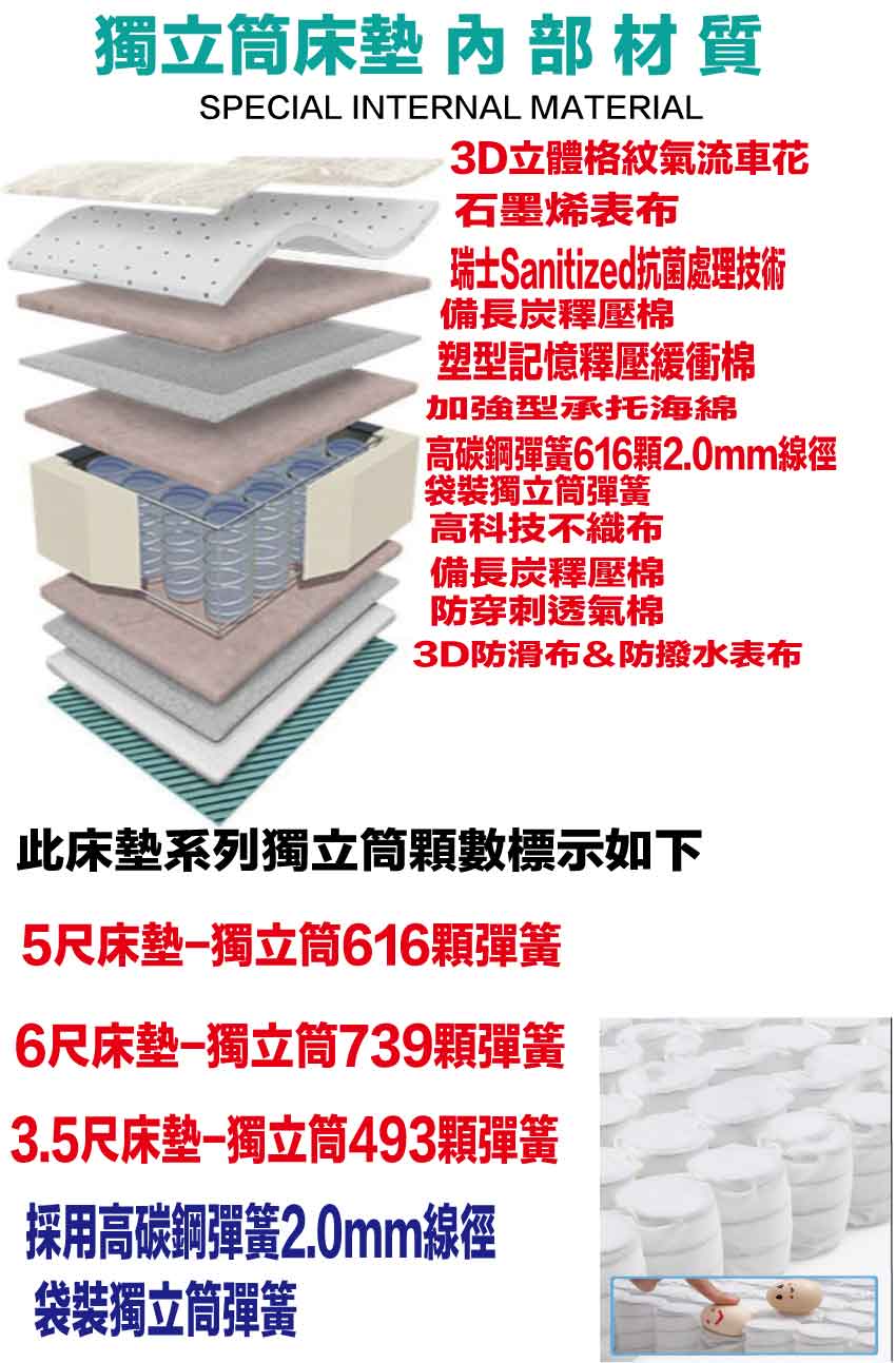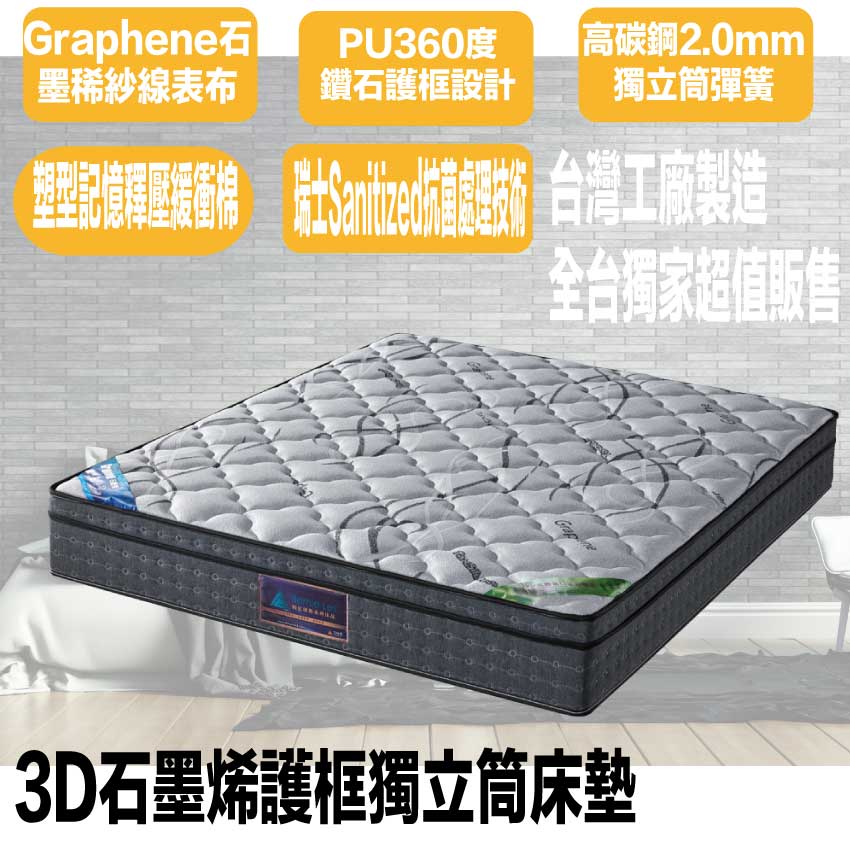 ◆產品名稱:【文創集-床墊系列】3.5尺單人石墨烯護框獨立筒床墊◆商品尺寸:(寬)105x (深)188 x (高)26.5/公分◆商品材質:3D立體特殊氣流車花+Graphene石墨稀紗線針織舒柔表布+瑞士Sanitized抗菌處理技術+防穿刺透氣棉+止滑透氣底布+塑型記憶釋壓纋衝棉+PU 360度鑽石棉護框+備長碳釋壓棉+高碳鋼493顆2.0mm靜音抗擾中鋼彈簧(袋裝獨立筒彈簧)+高科技不織布◆商品保固:中鋼彈簧體保固5年(正常使用),保用10年本產品款式共有單人加大(105cm)&雙人(150cm)&雙人加大(180cm)等三種尺寸可供您選擇,請先確定床台的尺寸再購買