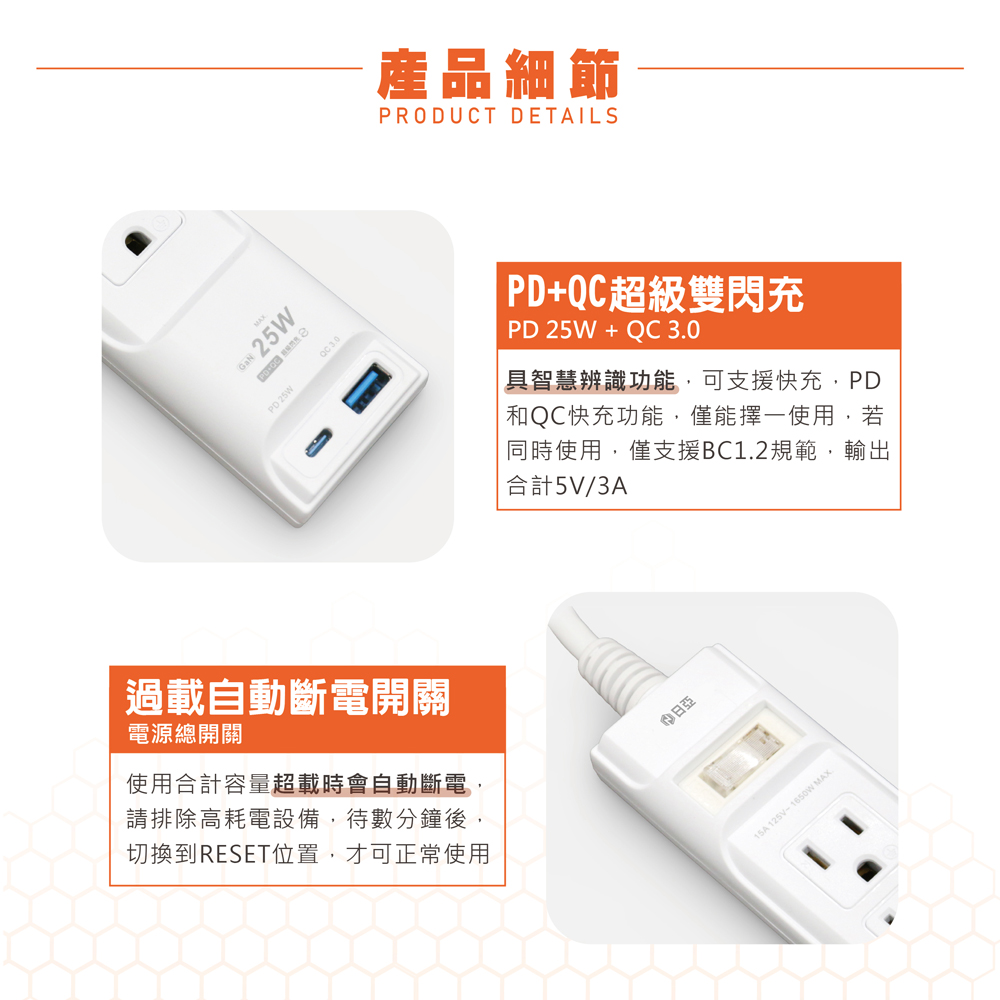 全台首創!科技散熱陶瓷-每個插座皆有裝高科技散熱陶瓷,陶瓷有耐高溫性接觸熱能散熱更快!符合BSMI新安規2 USB,智慧辨識PD25W+QC3.0過載斷電總開關本體防火耐熱材質插座防火PC材質雙阻燃絕緣線USB充電插座適用iphone2.0mm導線,千足銅insideTYPE C PD 25W專用充電插孔▼商品規格品名:日亞3孔1開3插 2 USB快充PD25w +QC 1.8米延長線型號:C-81P25lC規格:3孔插1開關3插座2 USB(PD+QC)長度:6尺1.8m主要材質:銅、PC塑膠USB額定輸入電流:0.6AUSB輸出總功率:25WUSB輸出:TypeA-5V/3.0A、9V/2.77A、12V/2.08A,TypeC-5V/3.0A、9V/2.77、12V/2.08A(PD、QC快充功能只能擇一使用,同時使用時輸出合計5V/3A。)(設備本身不具任何充電協議時,TypeA支援DCP DE提供1.5A,TypeC不支援無快充協議充電)額定電壓:AC125V額定電流:15A額定容量:MAX 1650W最大突波吸收能量:25焦耳最大突波吸收電壓:2500V最大突波吸收電流:1200A製造日期:標示於包裝上產地:中國(台商製造,日本品質)保存期限:常溫保存10年驗證登錄:R64847 RoHS保固:新品瑕疵保固 ※使用前請先詳閱包裝上使用說明※圖片僅供參考,商品依實際供貨為準。※商品如有顏色區別,未特別說明則採隨機出貨,不供挑色。※商品如經拆封、使用、或拆解以致缺乏完整性及失去再販售價值時,恕無法退(換)貨!※產品文案為原廠(供應商)所提供,若有變動敬請參照實際商品為準。※請勿盜用圖片進行商業用途,違者必究