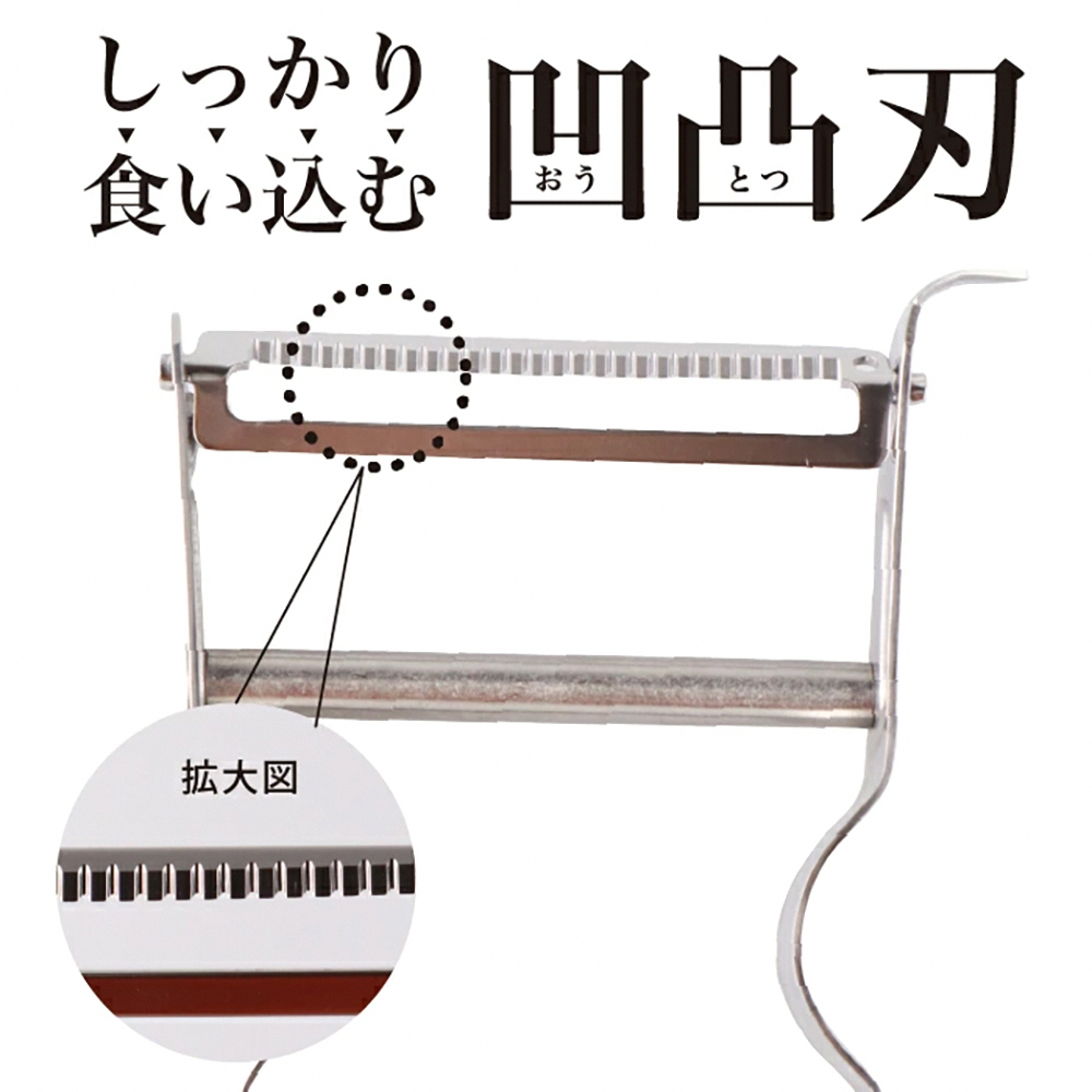 L型去除芽眼設計,可輕鬆去掉馬鈴薯的芽眼。握柄貼合手部,讓手不易疲憊,保持舒適握感。●新開發的凹凸刃