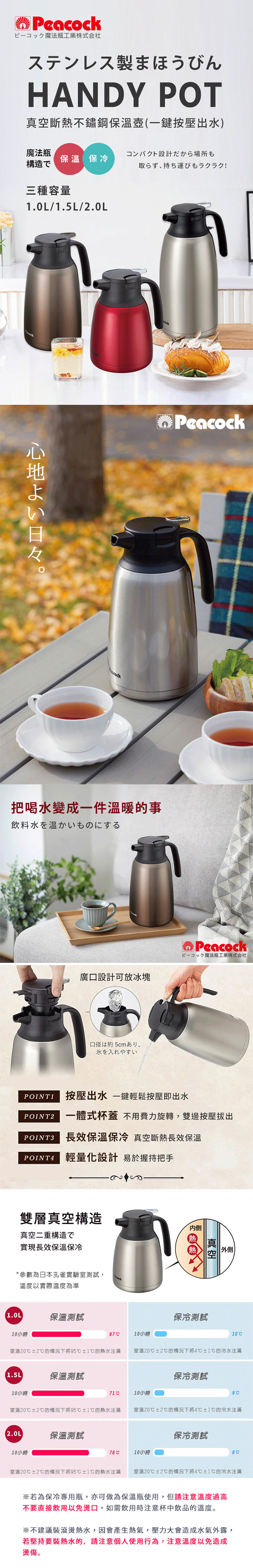【日本孔雀Peacock】真空斷熱不鏽鋼保溫壺保溫瓶 1.0L-原鋼色(一鍵按壓出水)