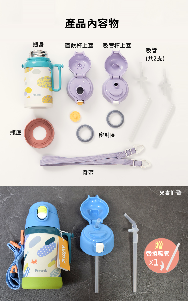容量:吸管杯時0.48(L)/直飲杯時0.49(L)口徑:42(mm)尺寸:吸管杯時117×86×188(mm)、直飲杯時117×86×187(mm)(附可拆式背帶)包裝尺寸:約98x102x253(mm)重量:約0.32kg(吸管杯)、約0.31kg(直飲杯)含包裝重量:約0.5kg材質:內瓶-不鏽鋼SUS304 外瓶-不鏽鋼SUS304(丙烯樹脂噴塗) 瓶口-不鏽鋼SUS304 上蓋、把手-聚丙烯樹脂 吸管、吸嘴、密封圈、瓶底-矽膠保冷效力:6小時10℃以下保溫效力:6小時64℃以上、1小時86度以上產地:日本孔雀-中國廠