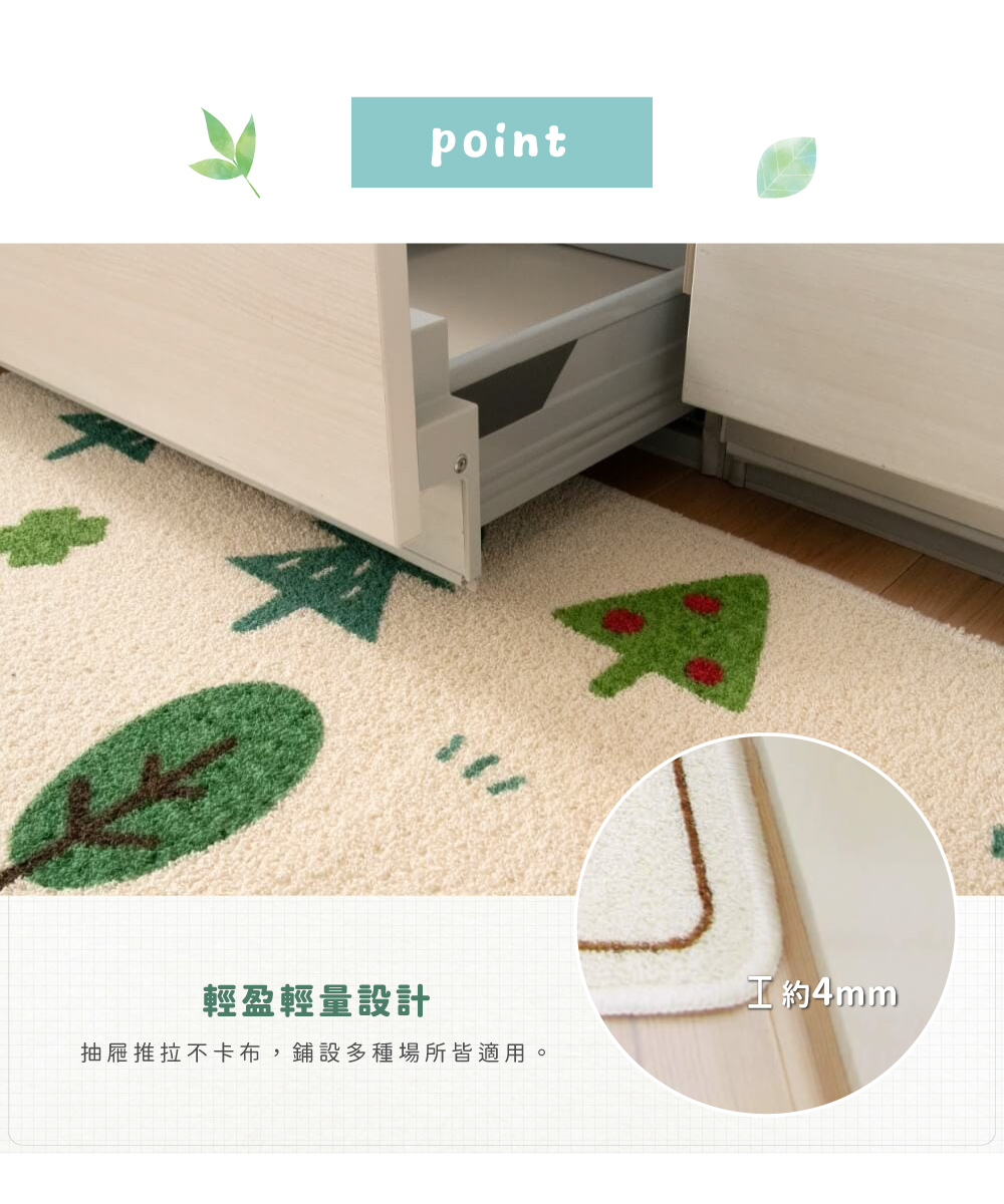 ●縫製堅固、不易變形,圓角設計使地墊不易翹起,腳不易被絆到,使用更安心。