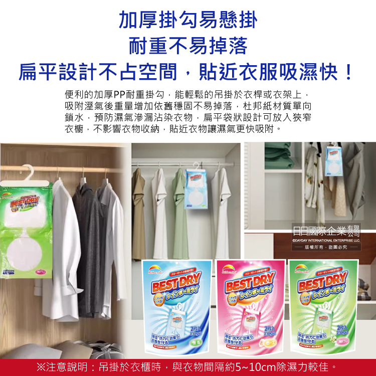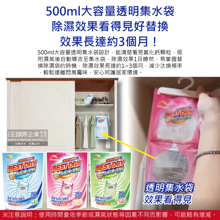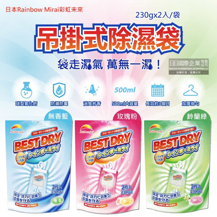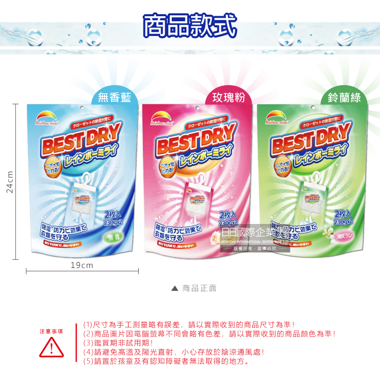 ●品牌:日本Rainbow Mirai彩虹未來●品名:吊掛式防潮防霉消臭除濕袋●成分:氯化鈣、防水劑、香料。●款式:無香藍、鈴蘭綠、玫瑰粉●用途:衣櫃吸濕消臭用。●規格:230gx2入/袋●含包裝重量:約490g●含包裝尺寸:約長19×寬4×高24公分●產地:中國●保存期限:5年(未開封時)●物流方式:常溫●保存方法:常溫下保存,勿讓陽光照射。●使用方法:打開外包裝,檢查除濕袋無破損後,將掛勾確實扣合於除濕袋上,吊掛於需除濕之場所(密閉式空間內)即可。※使用時間約1~3個月(依季節或濕氣狀態不同,可能略有增減)。●注意事項:(1)尺寸為手工測量略有誤差,請以實際收到的商品尺寸為準!(2)商品圖片因電腦螢幕不同會略有色差,請以實際收到的商品顏色為準!(3)鑑賞期非試用期!(4)請避免高溫及陽光直射,小心存放於陰涼通風處!(5)若不慎濺入眼睛,勿揉搓,請用清水沖洗15分鐘以上並就醫。(6)請置於孩童及有認知障礙者無法取得的地方。(7)標準吸濕量約為500mlx2入(於室溫25度、濕度為80%的環境中)。(8)請勿使用於吸濕外的用途。(9)請吊掛使用,勿倒置以免滲漏,如不慎滲漏,可用小蘇打水擦拭。(10)請勿擠壓,以免破壞除濕袋的結構導致滲漏,如有破損請勿使用。(11)請勿食用,如不慎誤食,請飲用大量水或牛奶並速就醫。(12)吸收濕氣後的液體,請勿澆花或用於其他用途。(13)除濕過程中氯化鈣結塊為正常現象。(14)當濕度與溫度過低時會出現白色結晶,不影響除濕功能。(15)如液體不慎沾染肌膚,請立刻洗淨。(16)吊掛於衣櫃時,與衣物間隔約5~10cm,除濕力較佳。