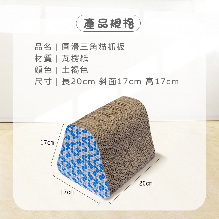 【商品特色】大尺寸更好抓實心耐磨保護爪爪,安全無虞天然紙質製成圓滑設計不傷爪【退換貨須知】✨ 下單前請再次確認選購的商品尺寸、顏色款式……等符合您的需求,確認無誤後再進行下單,以免造成您後續換貨上的困擾。✨ 「鑑賞期」非「試用期」,若經拆封、使用後導致商品缺乏完整性,恕不提供退換貨服務。✨ 商品顏色尺寸難免會有些許色差或公差,如無法接受請勿下標。✨ 物流運送過程難免受撞造成凹罐,不會影響內容物品質,介意者請慎選!!【其他資訊】商品名稱:圓滑實心三角形貓抓板 寵物玩具 貓抓板 圓滑實心 三角貓抓板 實心貓抓板商品編號:V05253尺寸:20x17x17cm標籤:#貓抓板, #圓滑實心貓抓板, #三角貓抓板, #實心貓抓板, #寵物玩具, #瓦楞貓抓板
