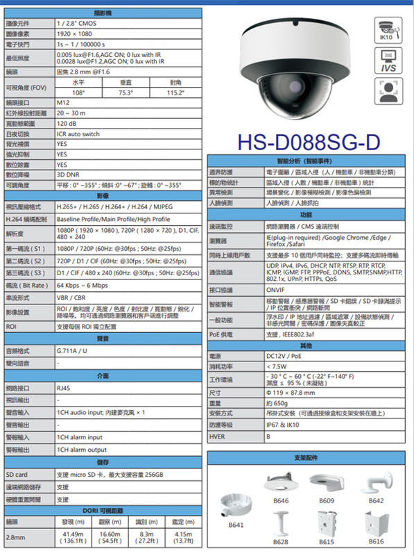 -H.265+ / H.265 / H.264+ / H.264 / MJPEG-2MP ( 1920 × 1080 )-20 ~ 30 m 紅外夜視距離-支援 3D 數位降噪 / 真實寬動態 / 強光抑制 / 背光補償 / 數位除霧 / 智能紅外線-ICR 紅外移動濾光片自動切換,實現日夜功能-支援 micro SD 卡,最大支援容量 256GB-支援 感興趣區域(ROI)編碼-支援三碼流-IP67 & IK10 防護等級-支援智能分析功能 : 電子圍籬偵測(人 / 車輛),區域入侵偵測(人 / 車輛),人臉偵測,人臉抓拍