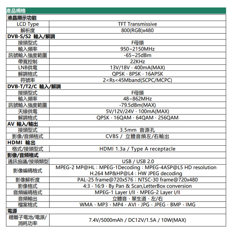 7吋 高清 TFT 液晶螢幕,800*480 螢幕解析度。支持 AV 輸入/輸出 & HDMI 輸入/輸出。內建 Ping 測試功能,可快速確認網路連線狀態。(New)支持螢幕截圖,可將測試畫面快速擷取並保存。(New)採用 MPEG-2 / H.264 編碼格式。可測量訊號強度,質量與光功率。內有星座分析儀、頻譜分析儀以及指南針功能。支持掃描 Auto、Blind、Manual 或 NIT。鎖定訊號的聲光警報。自動計算方位角(AZ)、仰角(EL)的角度,具有 LNB 短路保護。內建充電式鋰電池,方便攜帶操作。